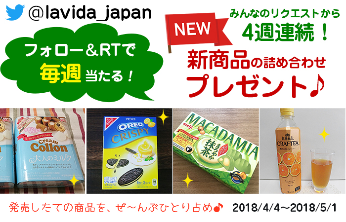 LA VIDAの公式Twitterアカウント @lavida_japanをフォローし、プレゼント告知のツイートをリツイート(RT)した方の中から毎週抽選で、新商品の詰め合わせをプレゼント!