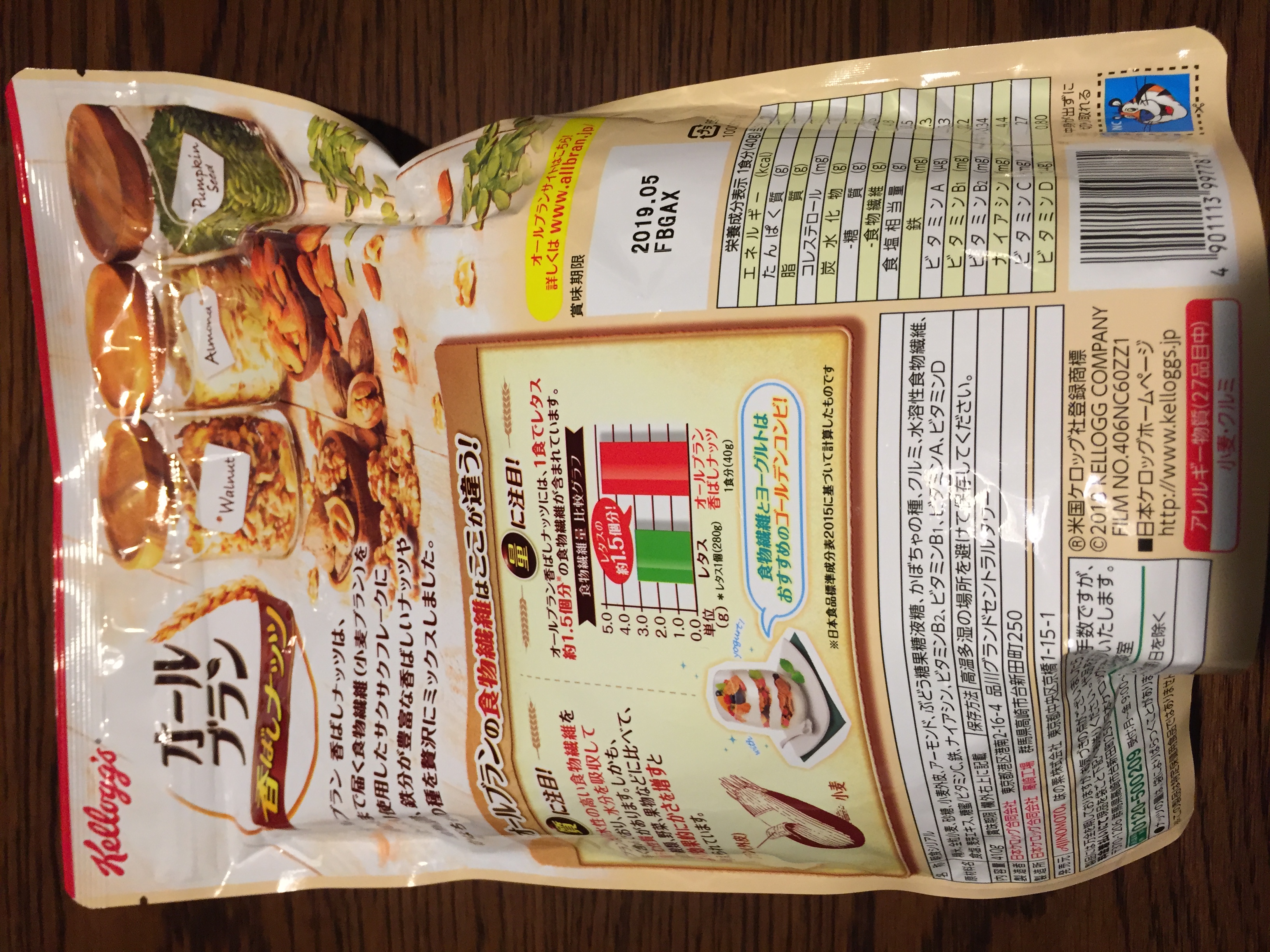 成分にも書いてありますが、「オールブラン 香ばしナッツ」は、腸の奥まで届く食物繊維を含む小麦ブランを使用した香ばしいザクザク食感フレークに、女性に人気のアーモンド、くるみ、かぼちゃの種を加えたシリアルです。
