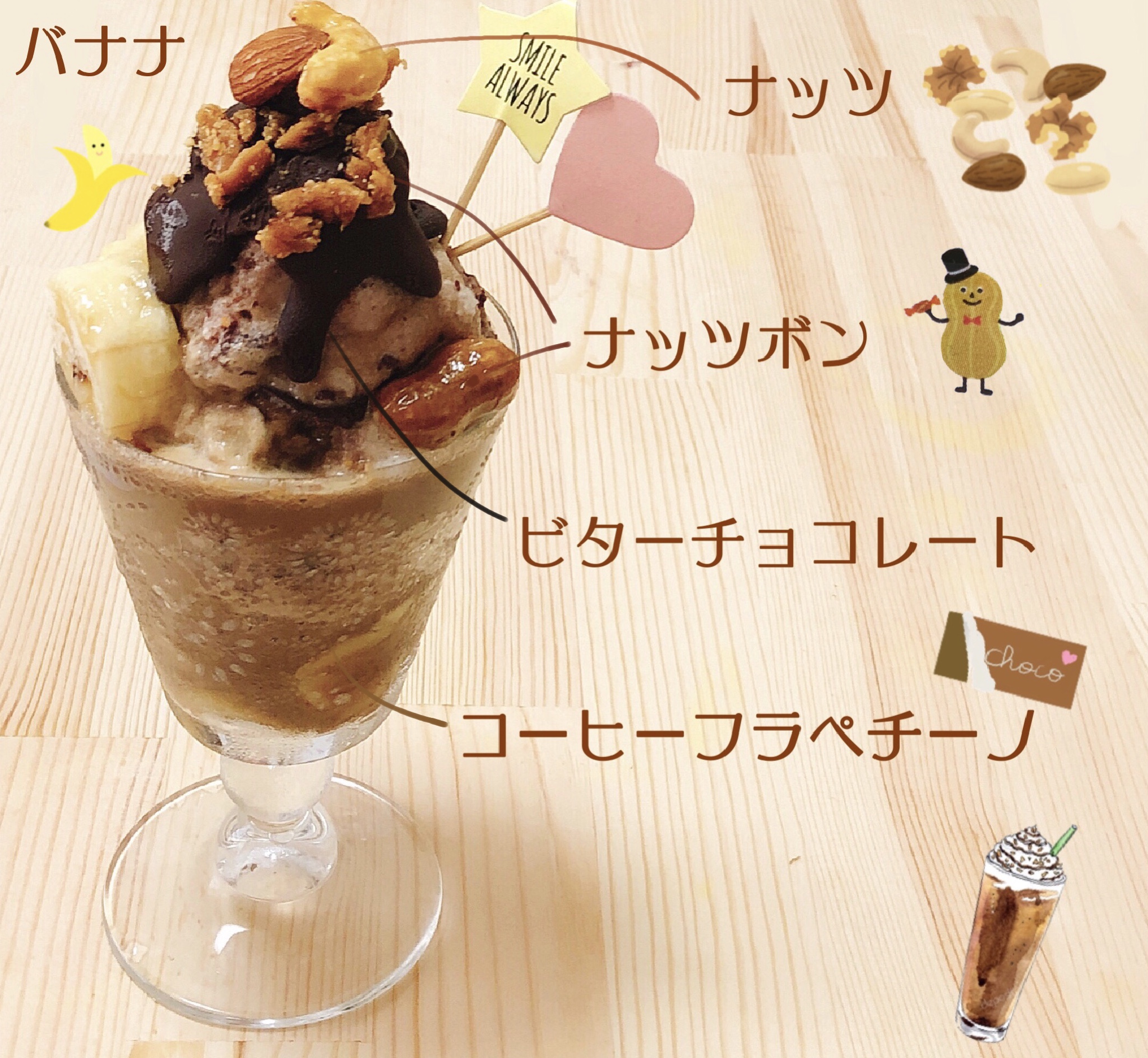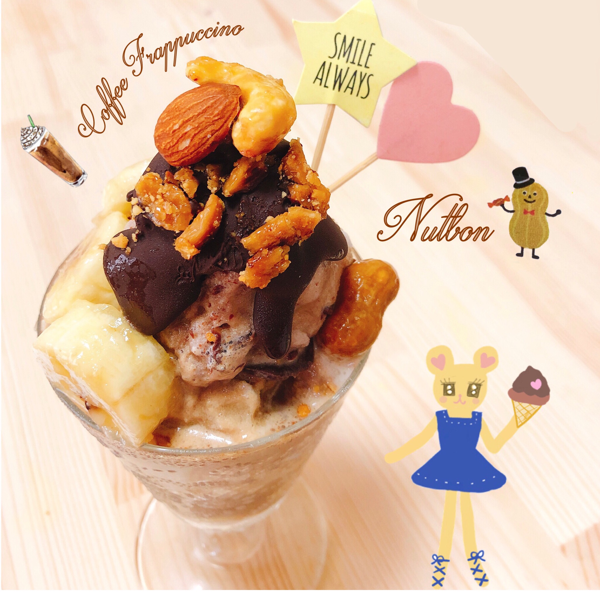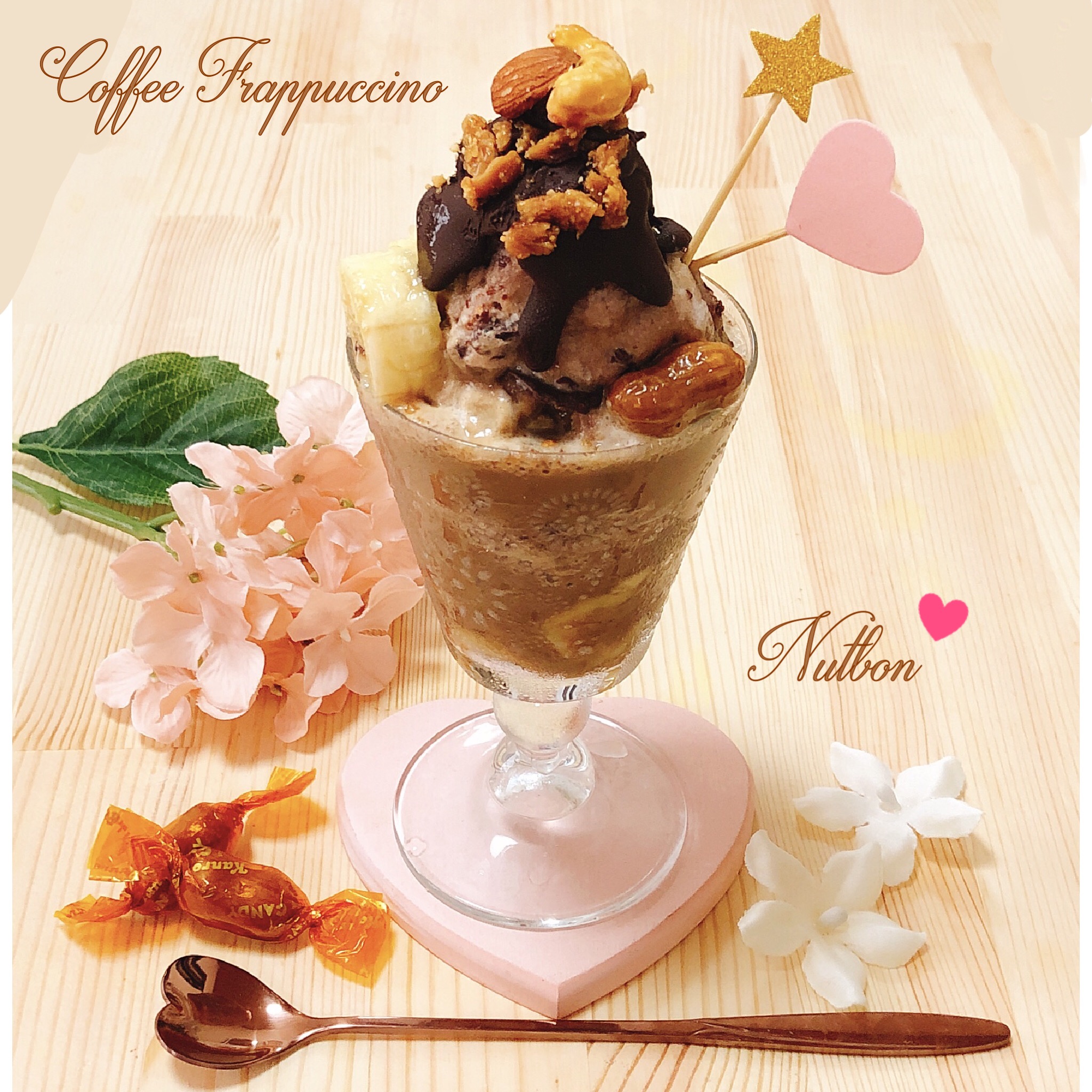 コーヒーフラペチーノに、チョコレートとナッツボンというカリカリキャラメルキャンディをのせました₍ᐢ •̥ ̫ •̥ ᐢ₎ ♥️
