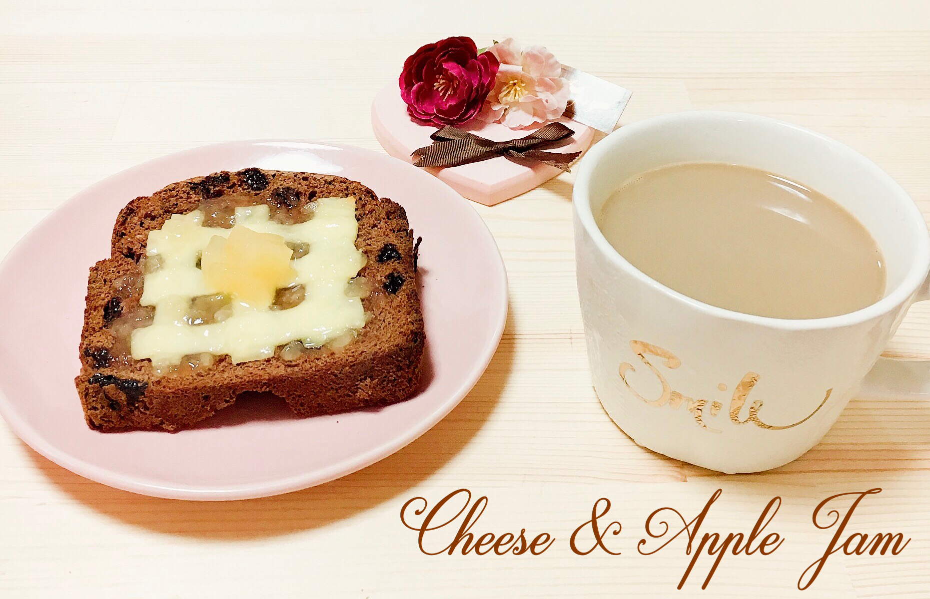 甘いチョコレートパンに、スライスチーズとりんごジャムを乗せました♪ .•*¨*♬✧