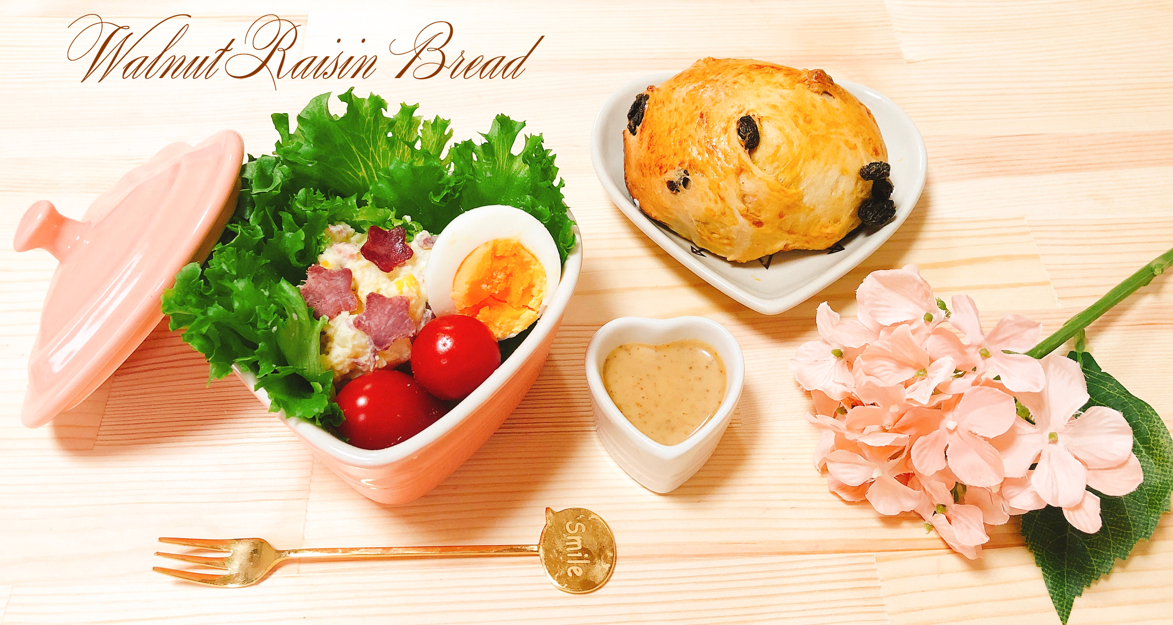 くるみレーズンパンを丸く成形して、サラダとおしゃれな朝食に.。❁*.:。❁ ♡