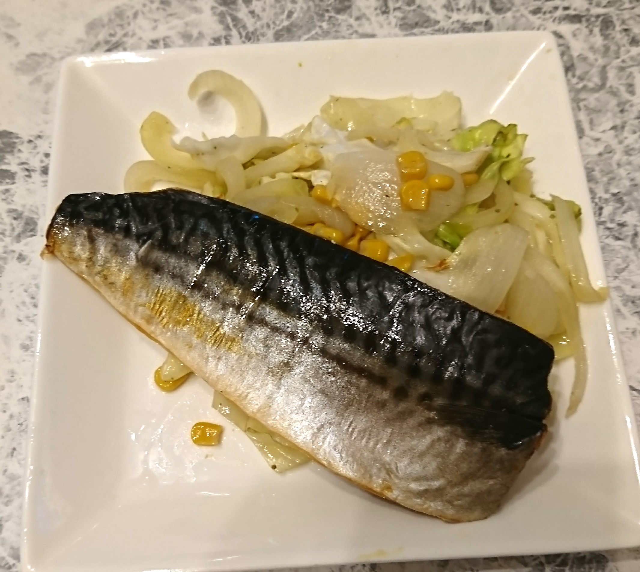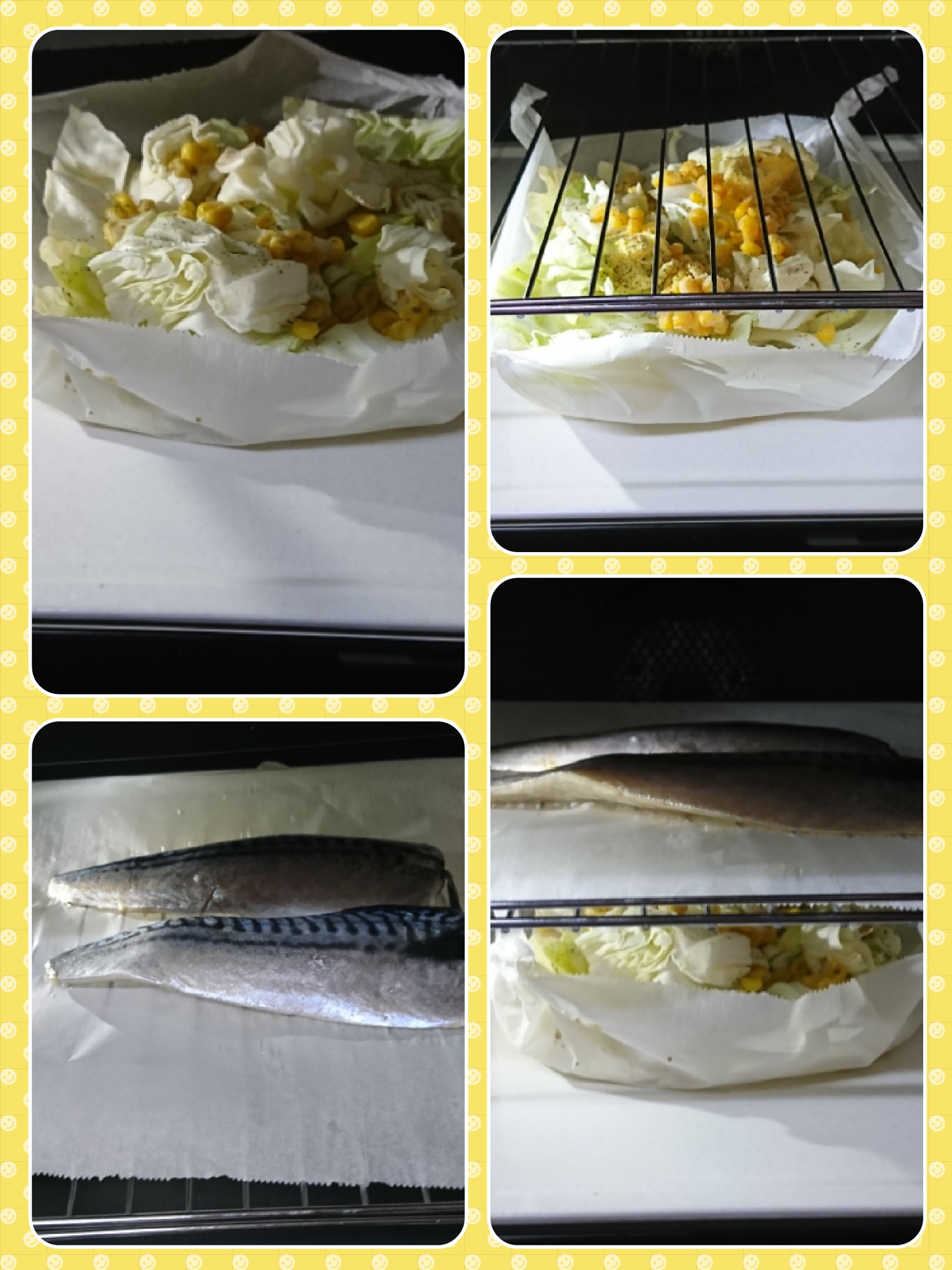 さっそく上段は塩鯖、下段はキャベツと玉ねぎ、コーンを蒸し焼き風に塩コショウ、バターを乗せてやってみました。