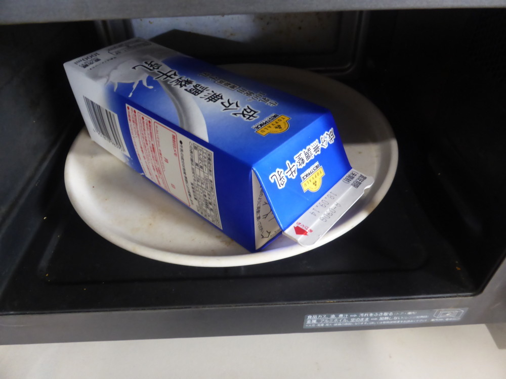 ①まずは牛乳を未開封のまま電子レンジで温めます。500W1分20秒。