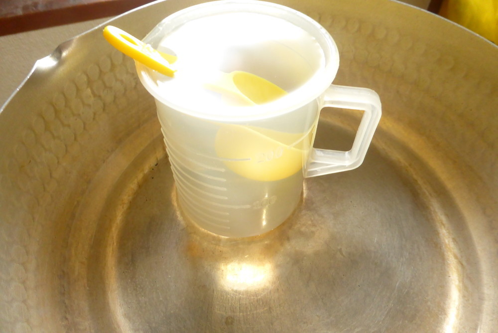 計量カップとスプーン、写真には写っていませんが、牛乳パックを止めるクリップ(100円均一で購入)を殺菌しました。70度のお湯に2~3分漬けます。