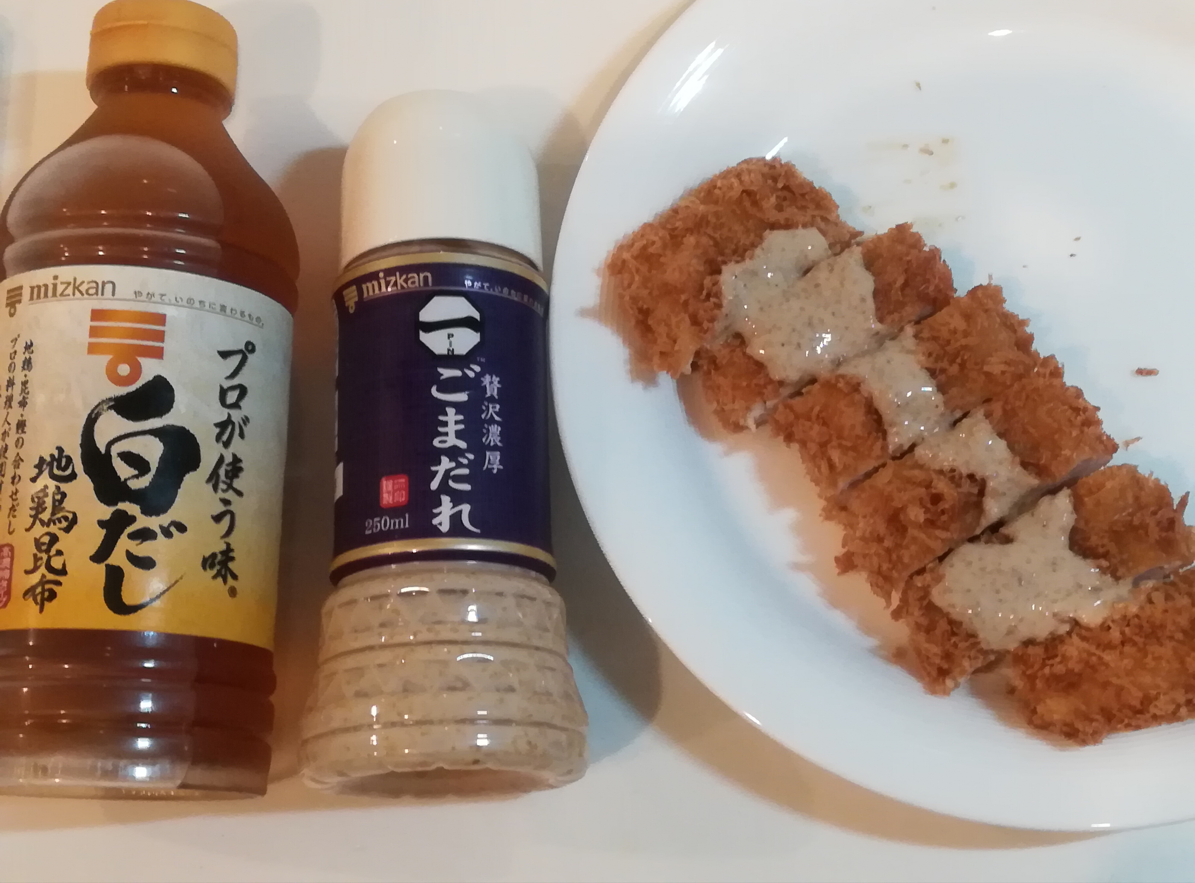 さくさくのカツに、濃厚贅沢ゴマだれをかけ、同じくミツカンさんの白だしをちょこっと混ぜたら、おいしくて、もうカツは食べに行かなくても家で良い~となりました♪