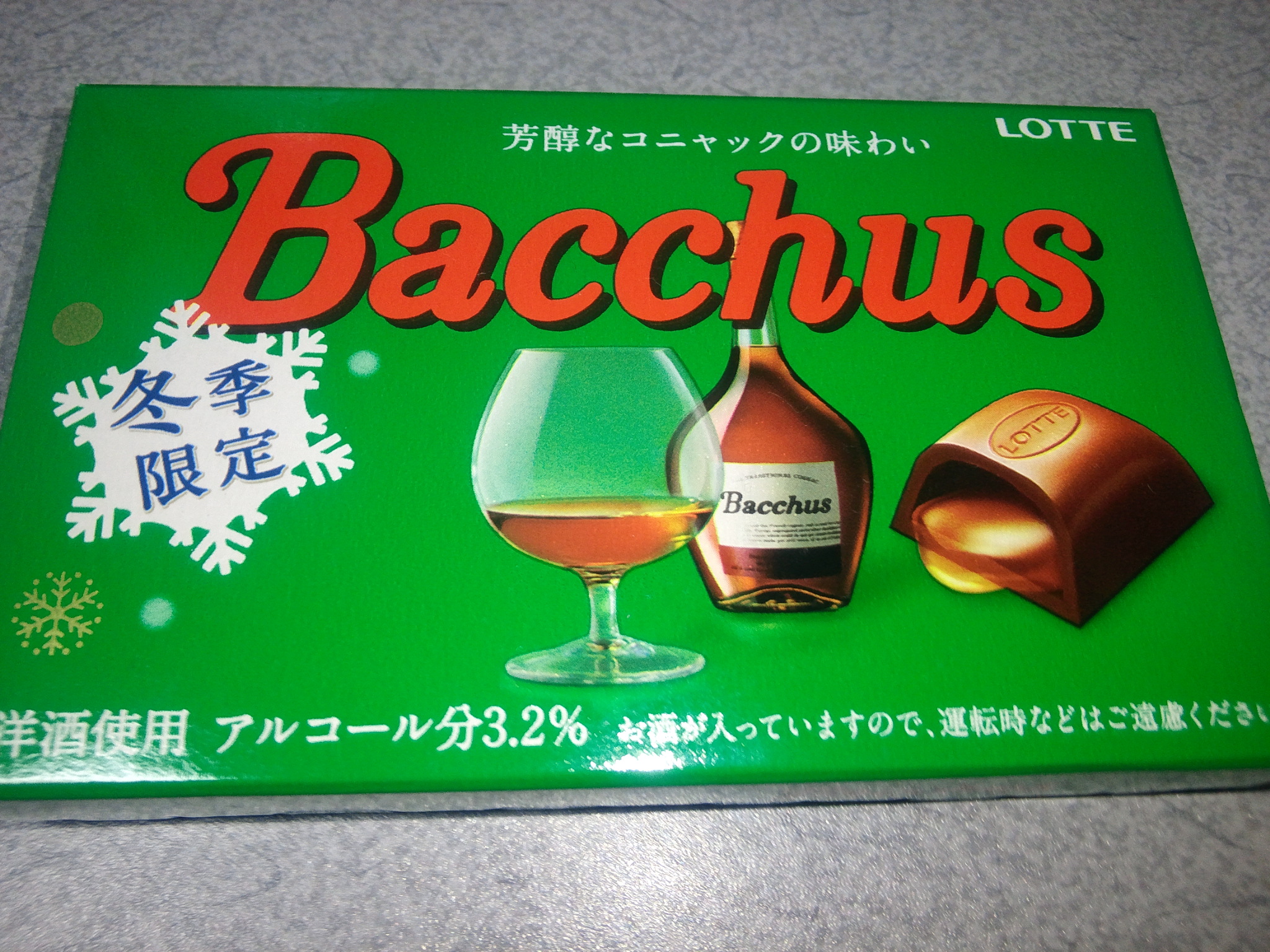 ロッテのチョコレート、バッカスです。冬季限定なので今季はもう手に入れられないかも知れませんが、ブランデーが入っていて大人のお味。毎年買っています♪