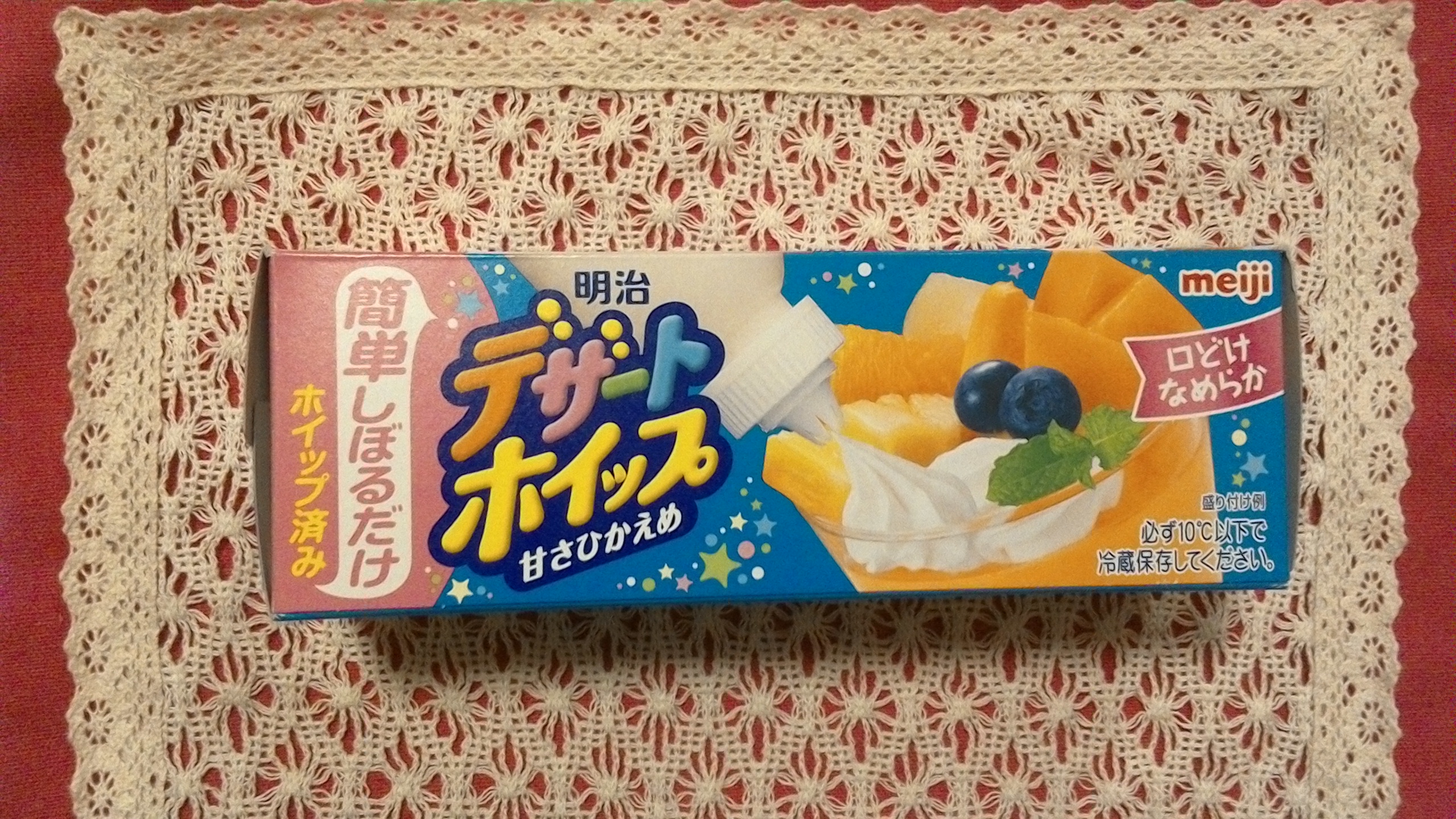 明治の植物性ホイップ「デザートホイップ」です。ホィップ済みなので生クリームを泡立てる時間がない時や少量だけ使いたい時に便利です。生クリームを搾り袋に入れる作業は、けっこう面倒なので、これだとチューブに入っていて星形のプラスチックの口金もついているのでが飾り付けが簡単です。残ったら大きくて平らなキャップがついているので口を下に冷蔵庫で立てて保管できます。