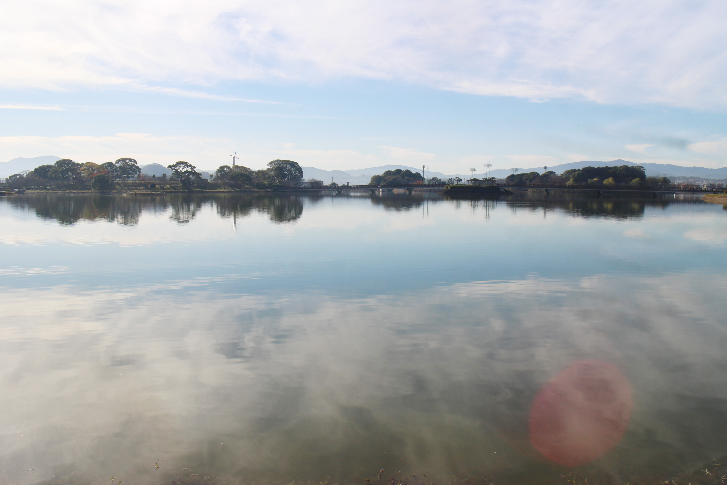 水に映った空!@福岡。近くにある一周4キロ、水と緑豊かな公園です。今年ものんびり、散歩が楽しめる一年でありますように♪♪♪