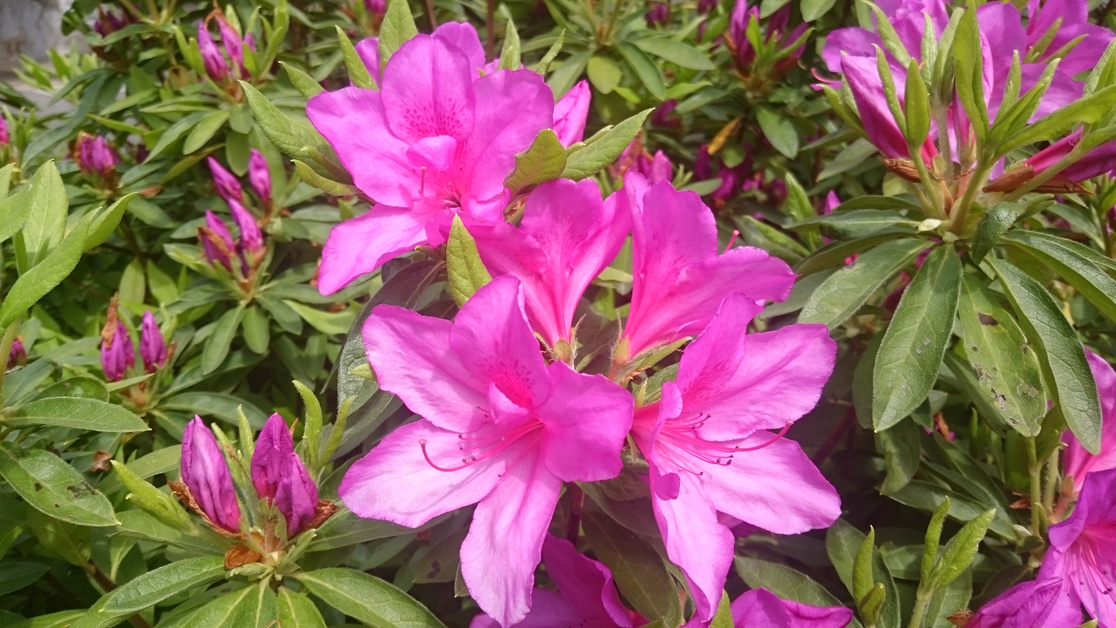 庭に白、ピンク、濃いピンクのつつじが咲き乱れています。