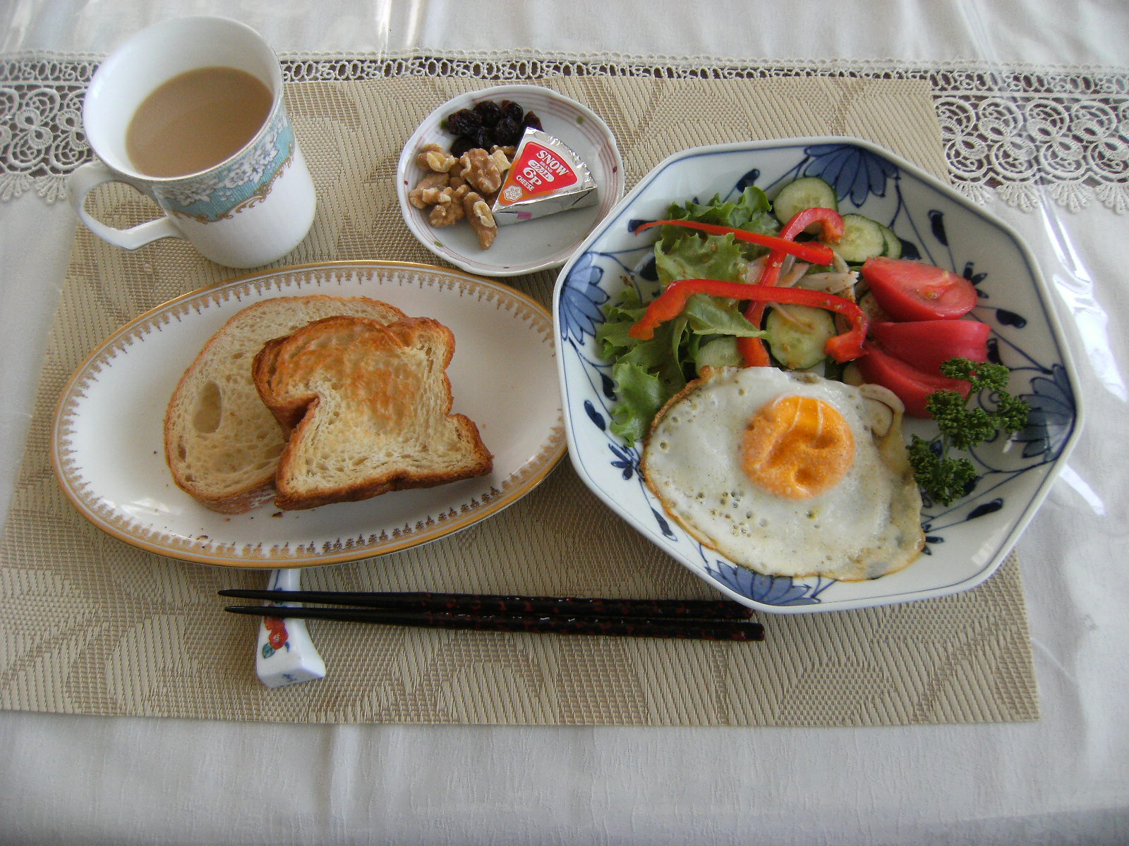 この写真は、私の今朝の分でほぼ毎朝野菜サラダ・チーズ・くるみ・目玉焼きそして、パンと牛乳入りコーヒーです。野菜サラダは無農薬の野菜を自分自身で育てたもので、旬を楽しんでいます