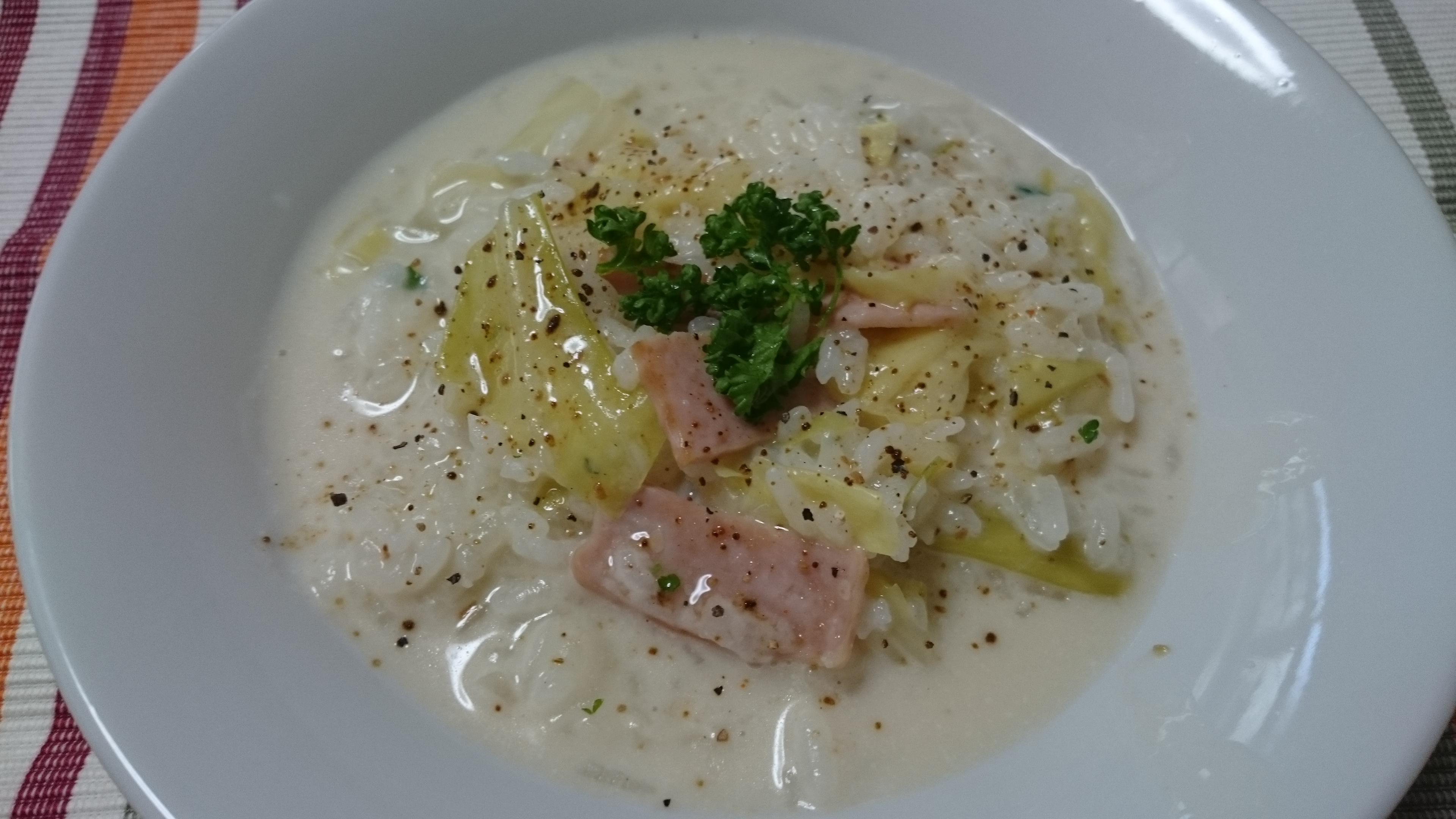 今朝は昨夜のホワイトスープの残りをリゾットにして食べました。