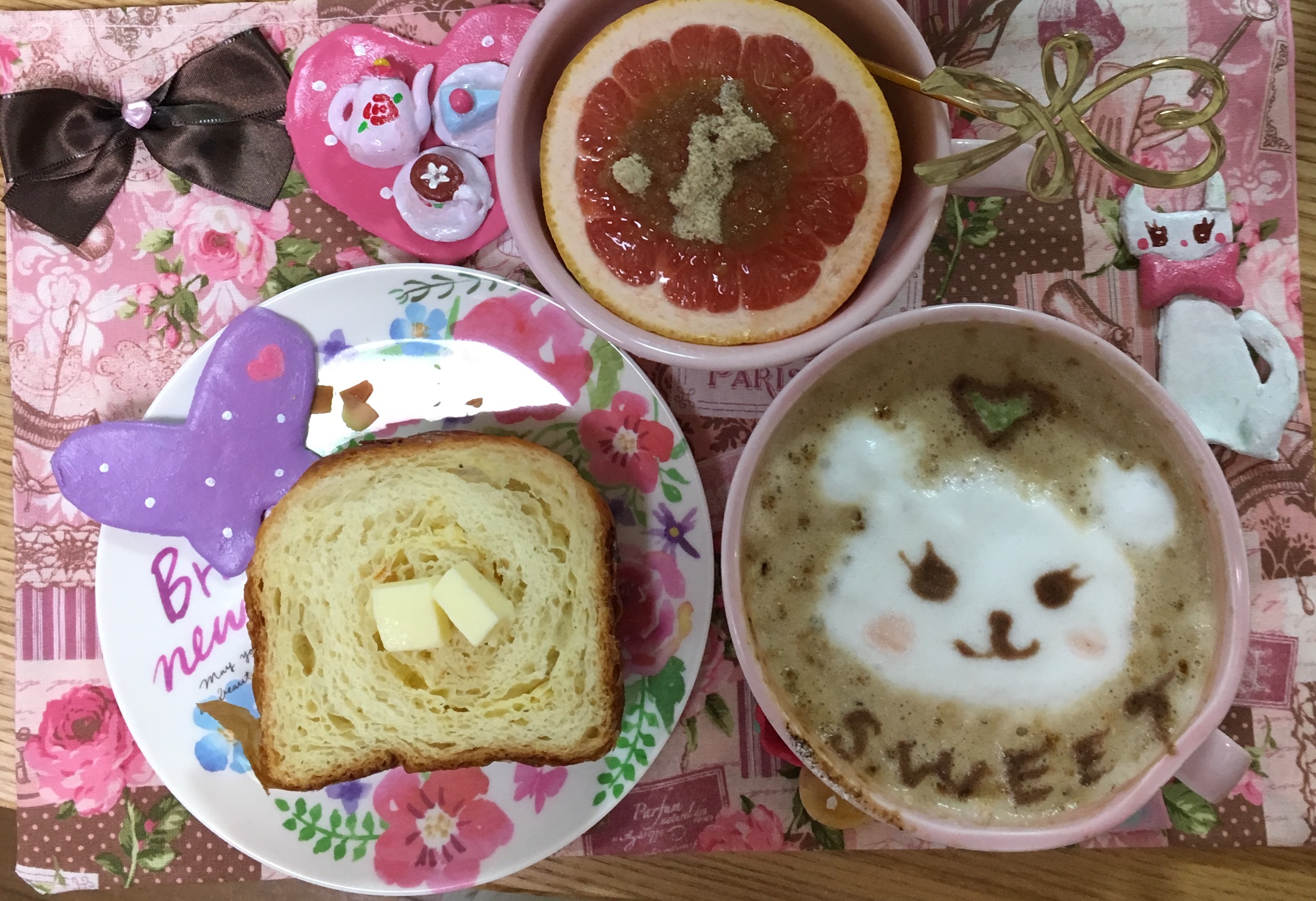 ポンパドールのオレンジデニッシュ、くまちゃんラテ、グレープフルーツに赤糖たっぷり乗せ♡