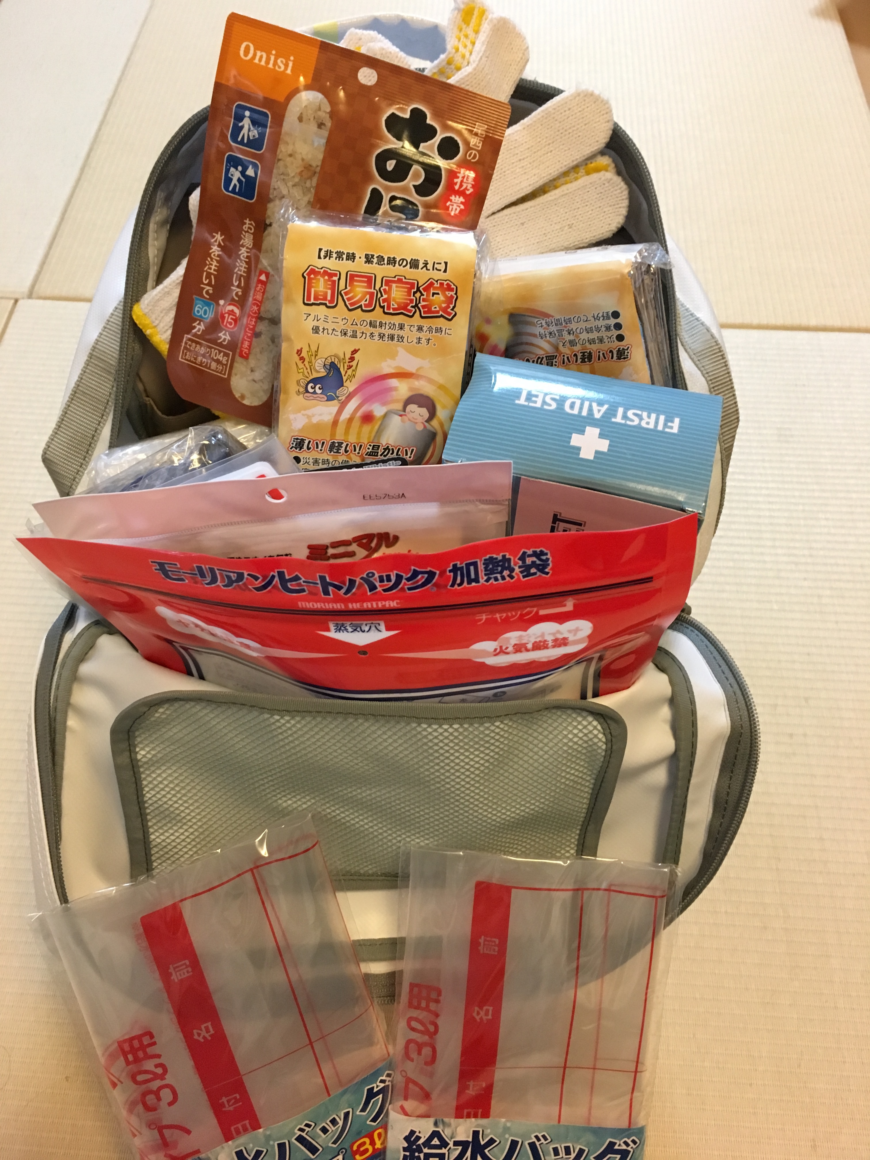 リュック型の防災グッズセット(2人用)を購入。そして、足りない分を追加で購入して、一緒に入れています。