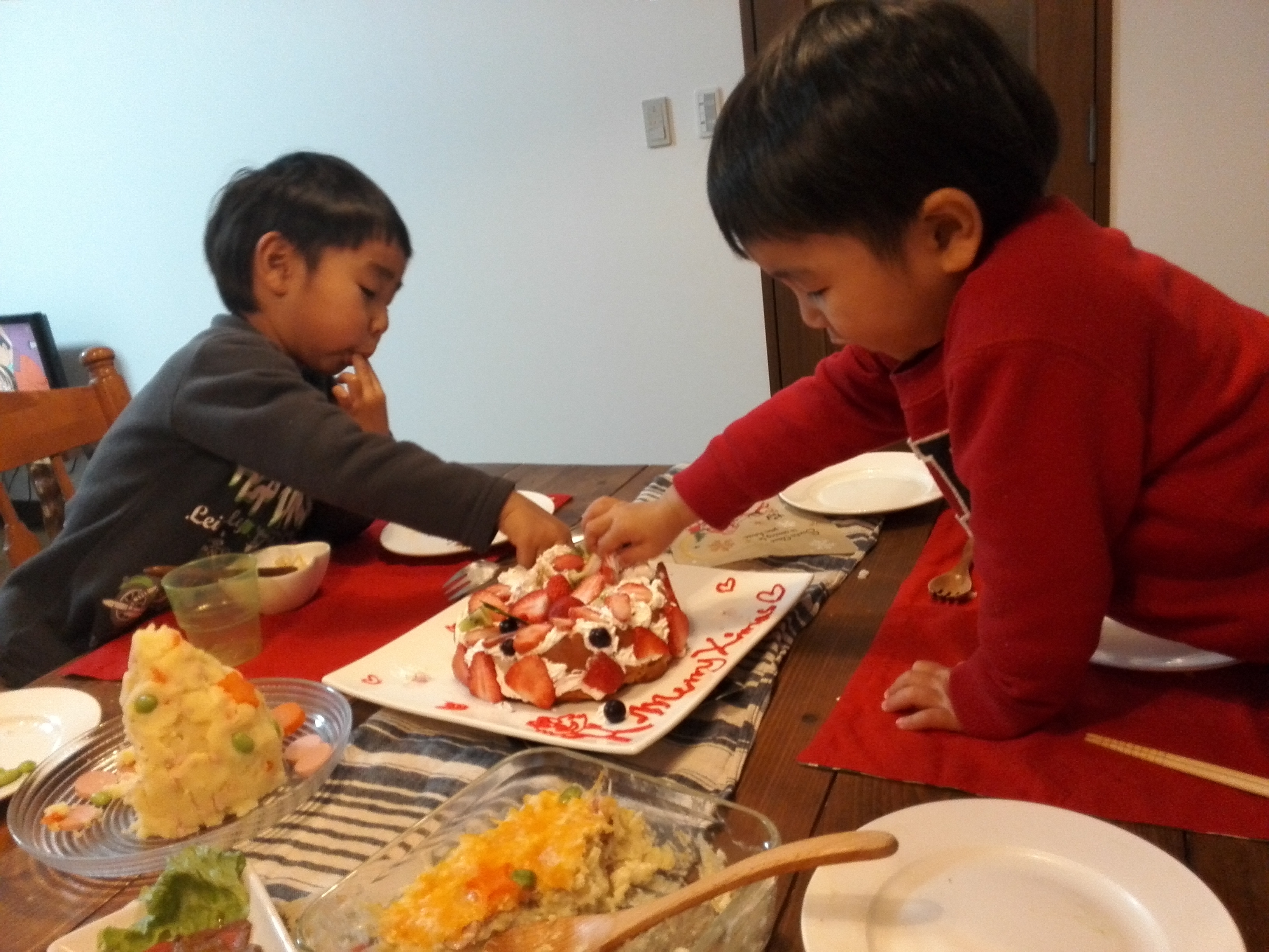 兄弟クリスマスケーキつまみ食い!!手作りケーキはなんと予算700円!生地は100円の甘い柔らかいパン!しぼるだけ簡単ホイップ200円カットフルーツ300円に赤のデコチョコペン100円!十分満足に美味しかったです☆