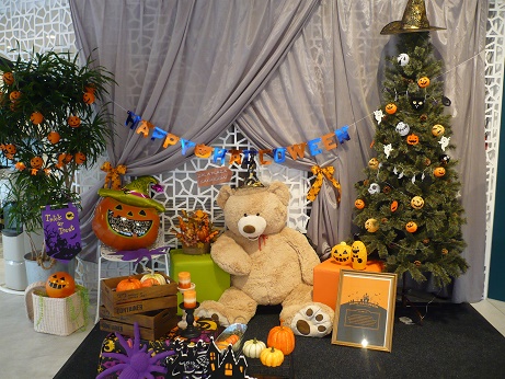 大きなクマのぬいぐるみの周りをハロウィンで飾りました。