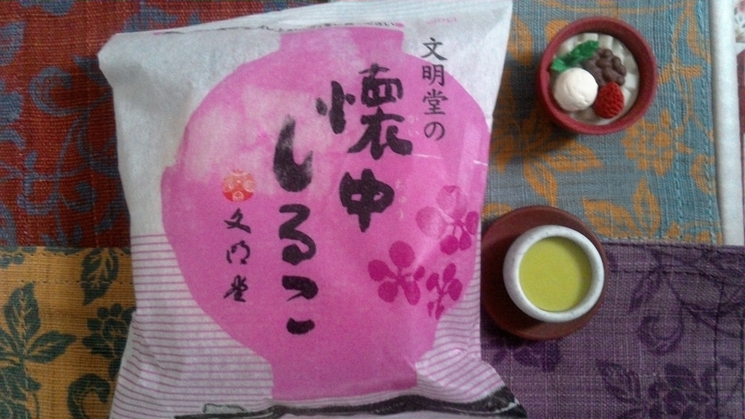 文明堂の「懐中しるこ」です。最中の中に粉末のお汁粉が入っています。お椀に割り入れお湯をかけて食べてます。お湯でやわらかくなった最中も美味しい。