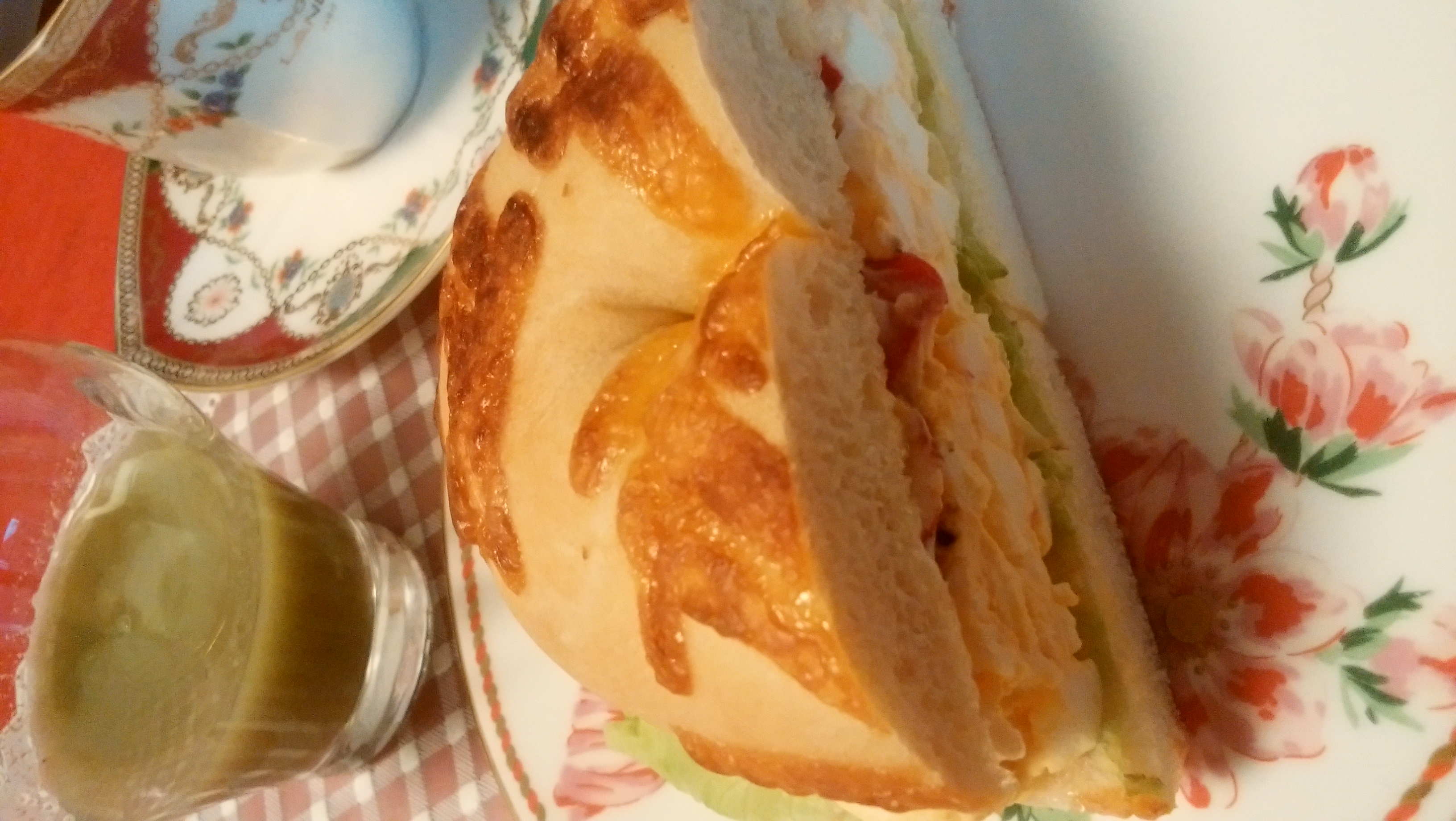 主人の朝食です。チーズベーグルにレタスとラディッシュとタマゴサラダをサンドしました。「卵が多すぎ(-.-#)」と叱られ半分残したので、それはそのまま私のランチにσ(^◇^;)