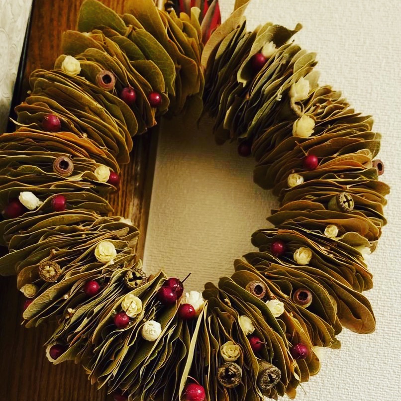 ユーカリの葉と木の実でリースを作りました。お花を使った小物作りが上手なお友だちの家で、教えてもらいながら、仲良しグループで集まってワイワイ楽しかったです。ワイヤーにさしていってボンドで貼っていくだけですが、ちょっと珍しいので気に入ってます。部屋じゅういい香りです。
