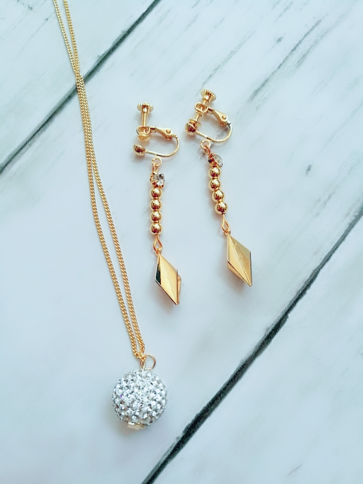 揺れるイヤリング、ラインストーンもきらっと光ってつけるとすごくきれいだろうなーと思います。本当、服を選ばずいろいろいろいろなコーディネートに合いそうですね。