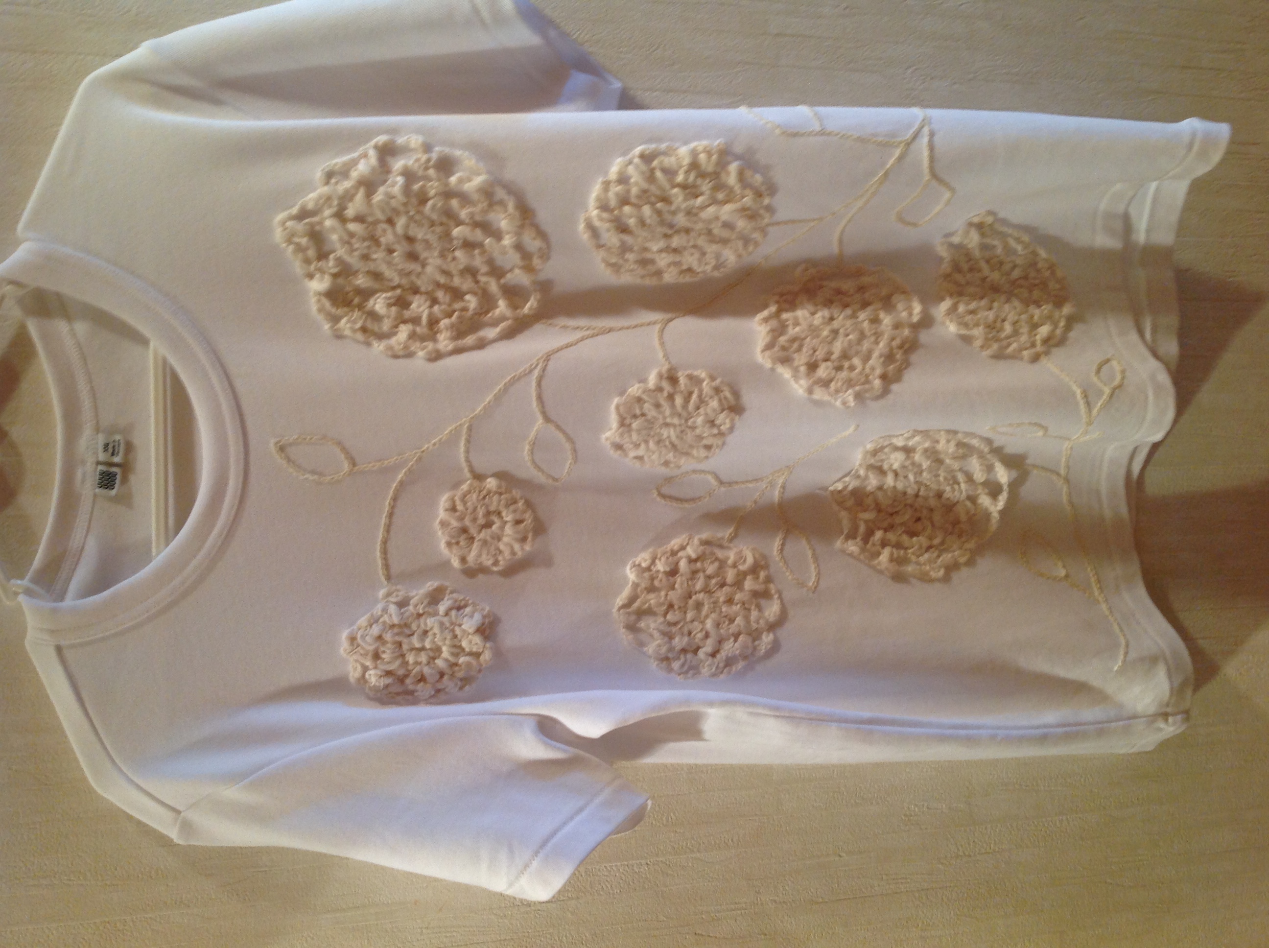 Tシャツに花形のモチーフを編んで、糸で縫って、その合間に刺繍してみました