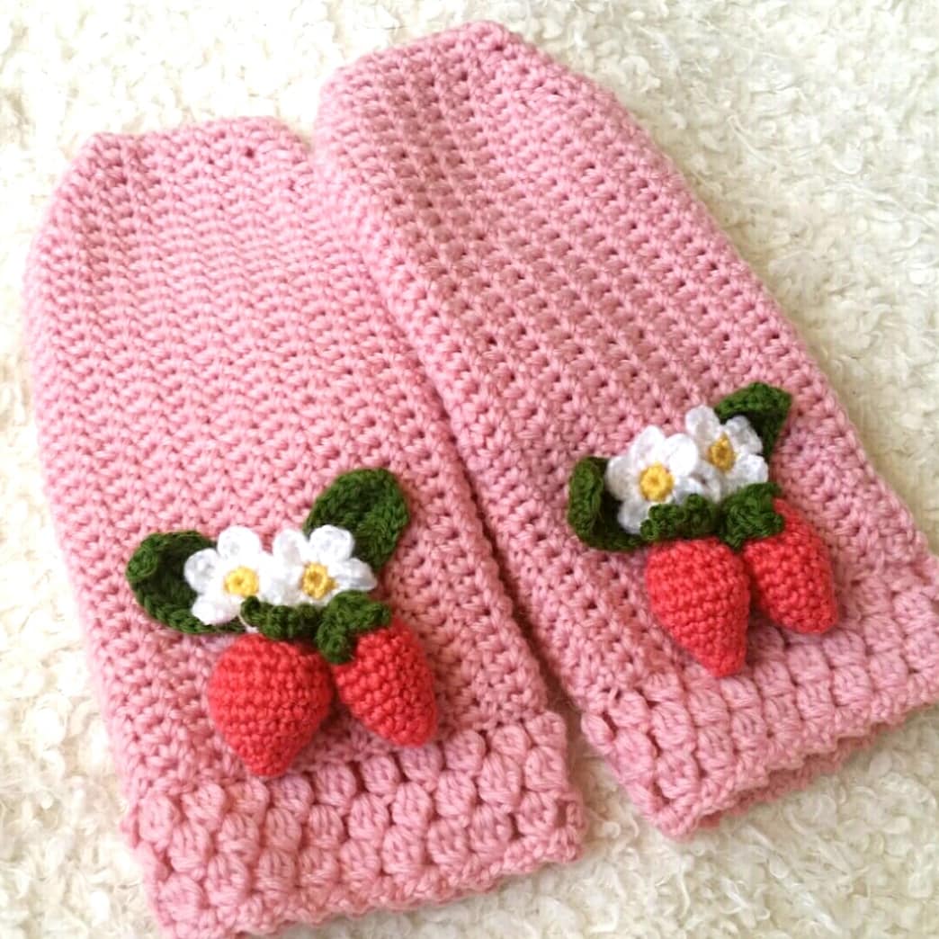 うすいピンクのいちごミトンを編みました。ふわふわで軽くて、女子の大好きいちご付き(笑)