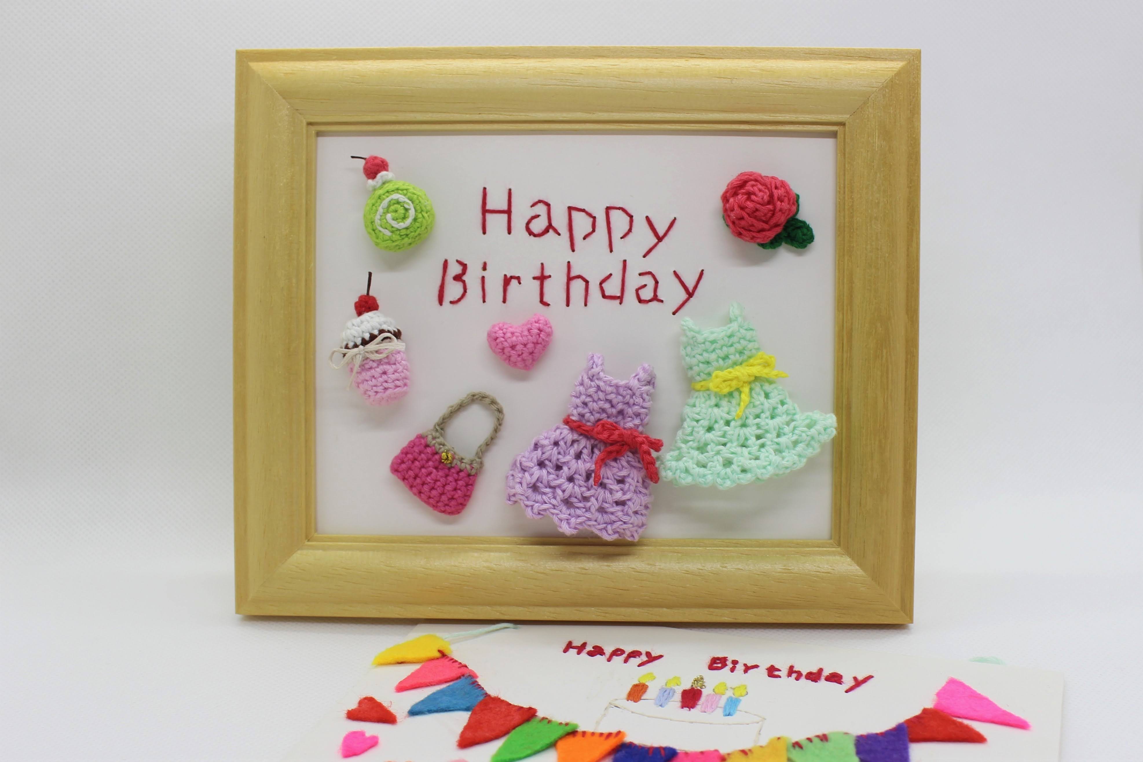お祝いの気持ちを伝えたくて、メッセージカードを作りました。厚紙に刺繍で文字を入れ、刺繍糸で編んだ小物やフェルトでデコレーションしました。明るい気持ちになってもらえるといいな♪