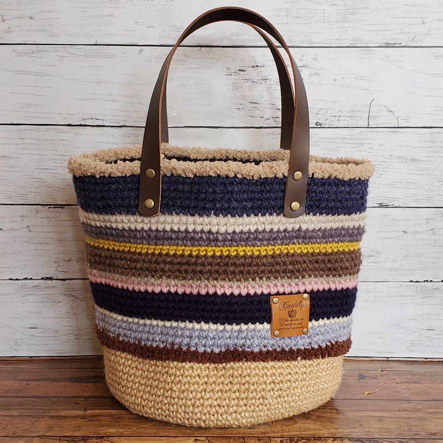 毛糸のバッグを編みました。底は麻紐でしっかりと。毛糸の色合わせがとっても楽しいです。