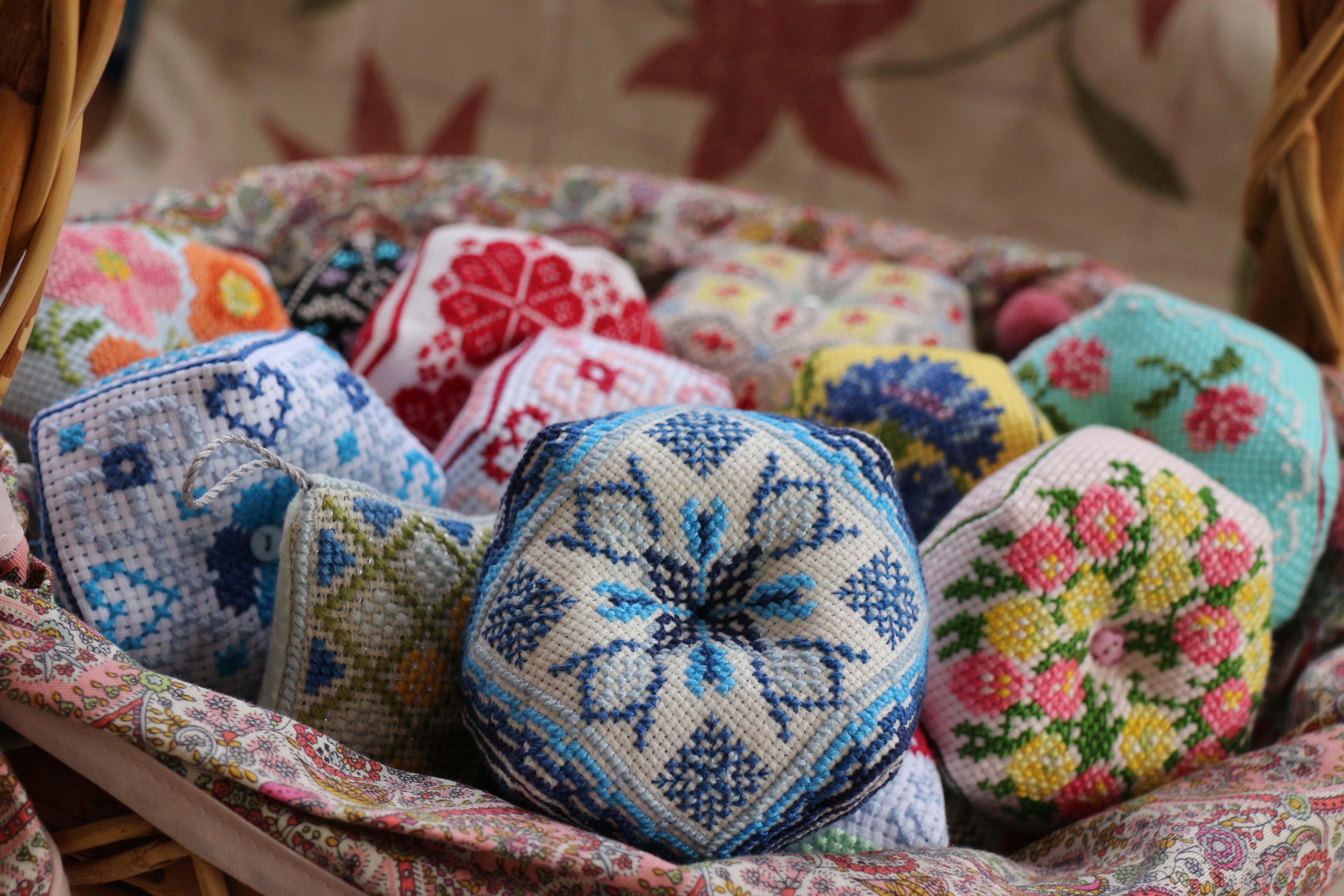 ビスコーニュを作って、かごの中がいっぱいになるのを楽しんでいます。キットやフリーチャート等々、今まで作りためたものです。