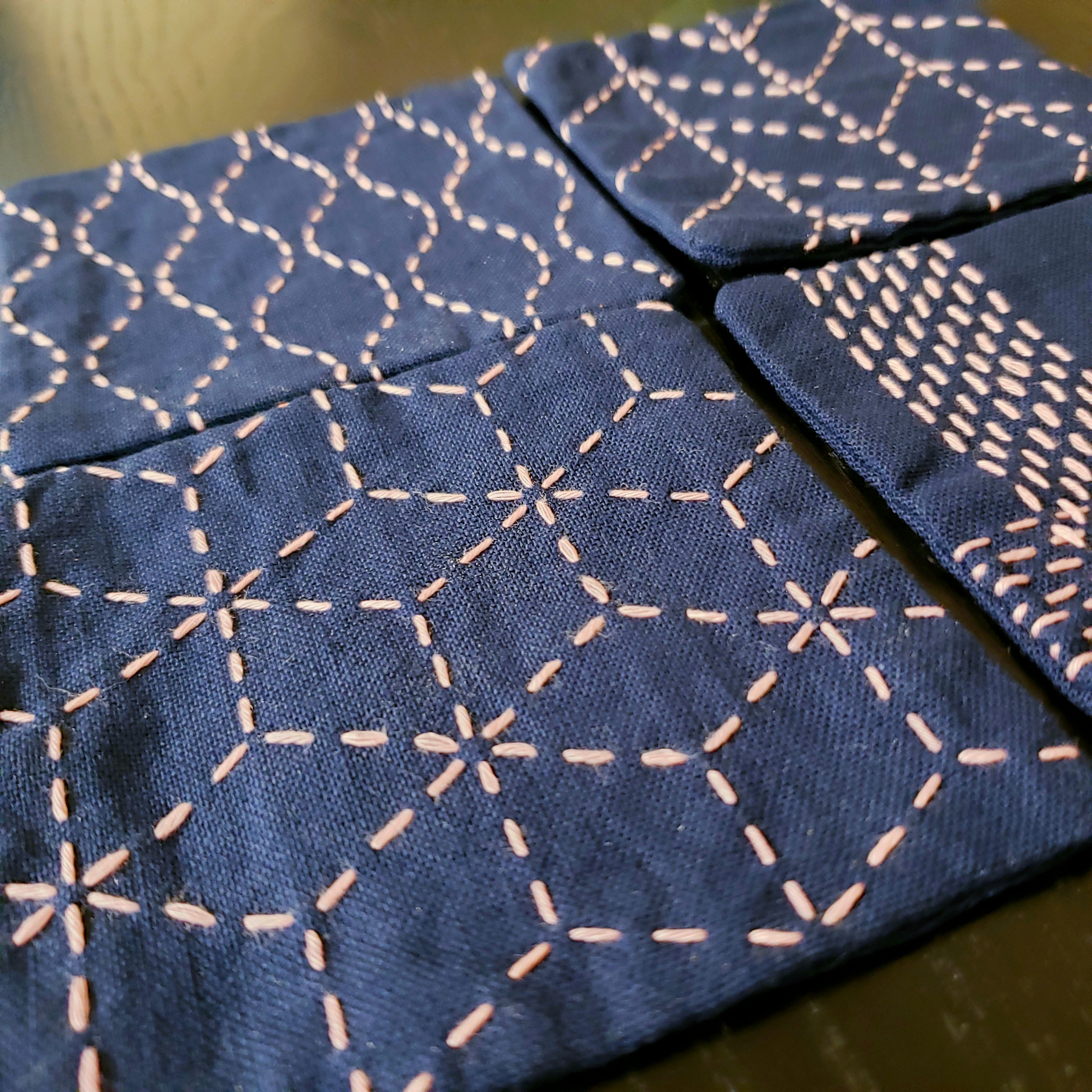 4枚完成したんですね 布と糸 色合いがマッチして素敵♬ お子さんご家族さんの グラスの下で活躍するのかなぁ
