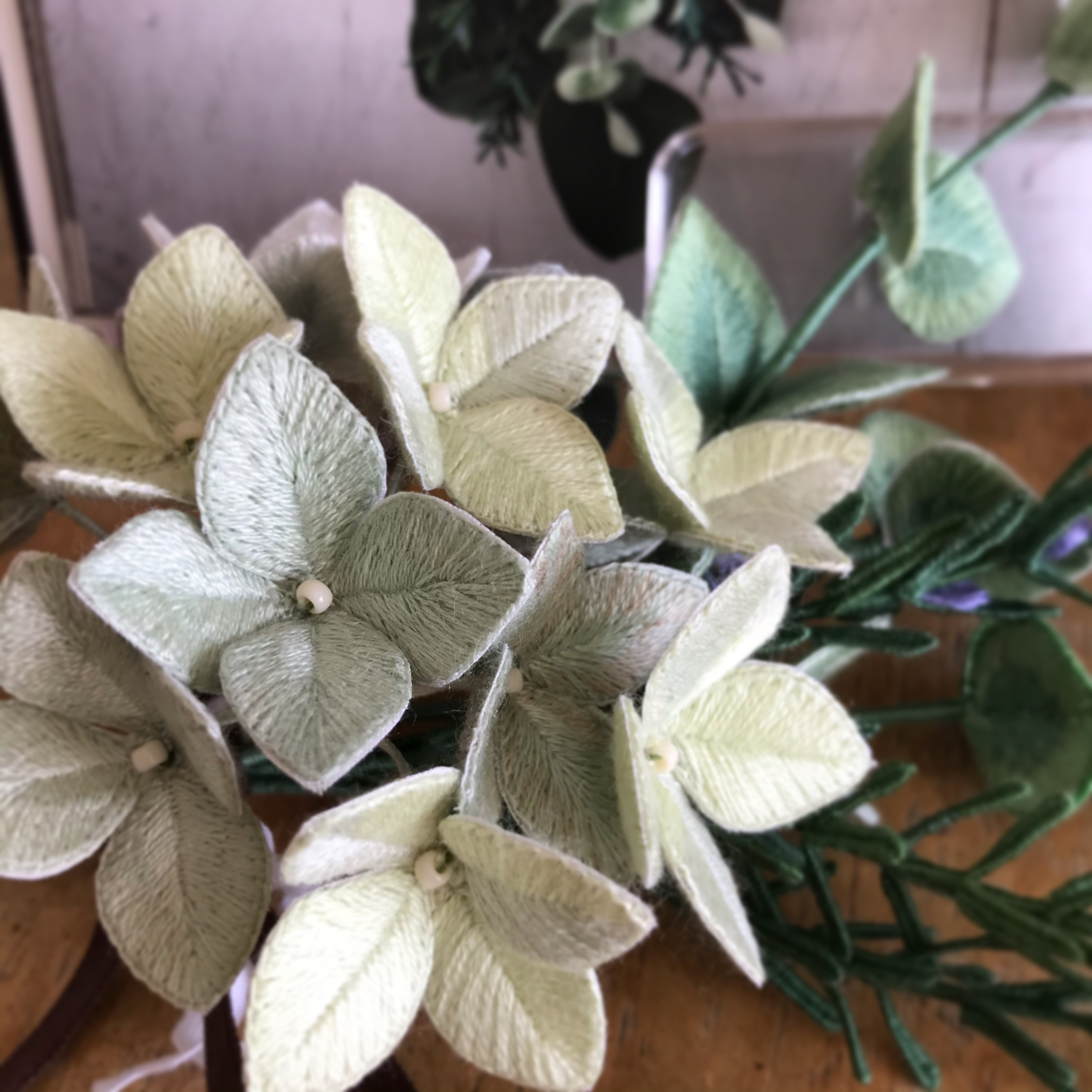 立体刺繍で紫陽花のスワッグを作りました。アトリエfilさんの本を見て作っています。