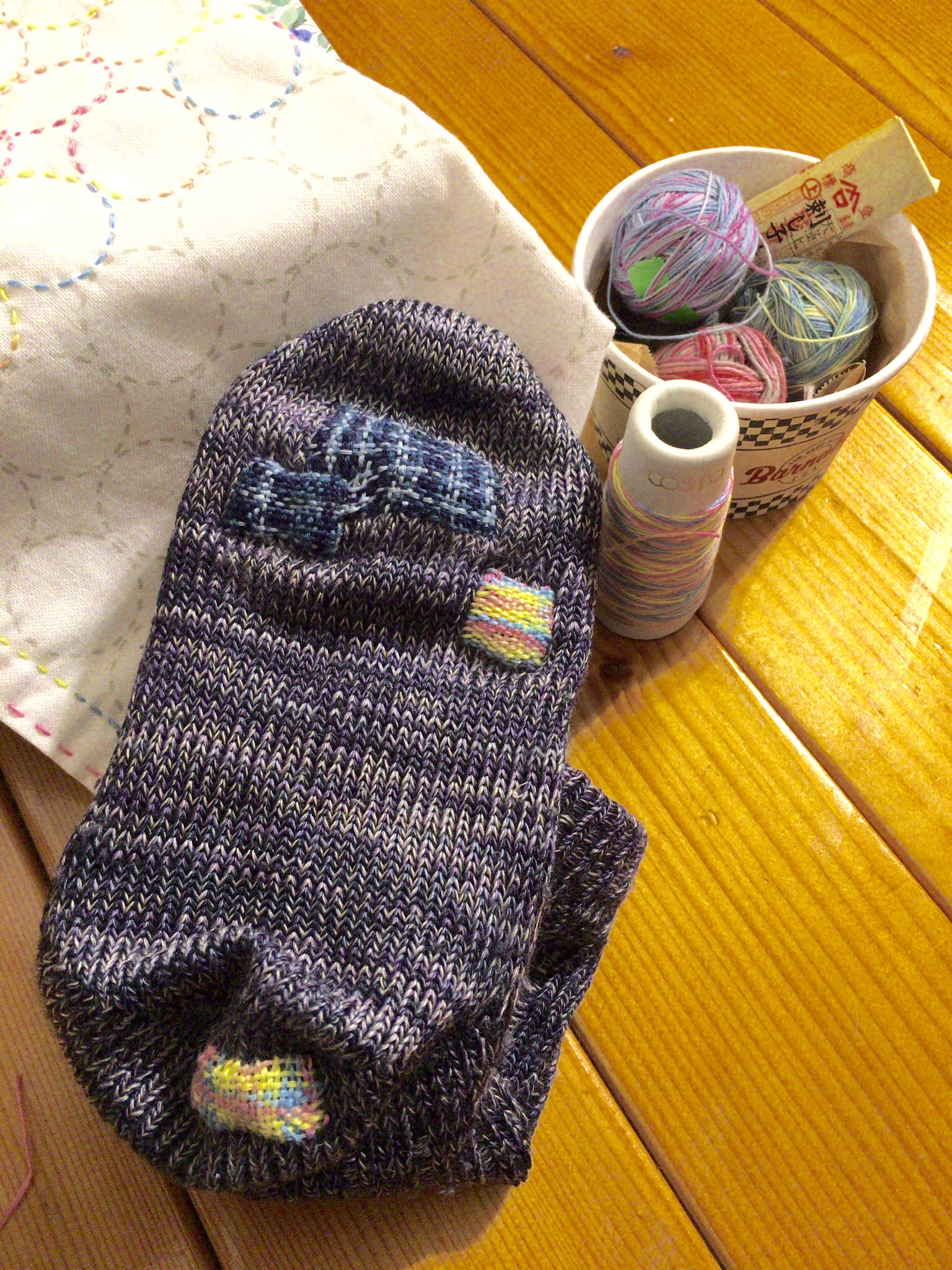 靴下で失礼します。。カワイイ 色が気になって 刺し子糸hidamariでダーニング(^ ^)してみました。