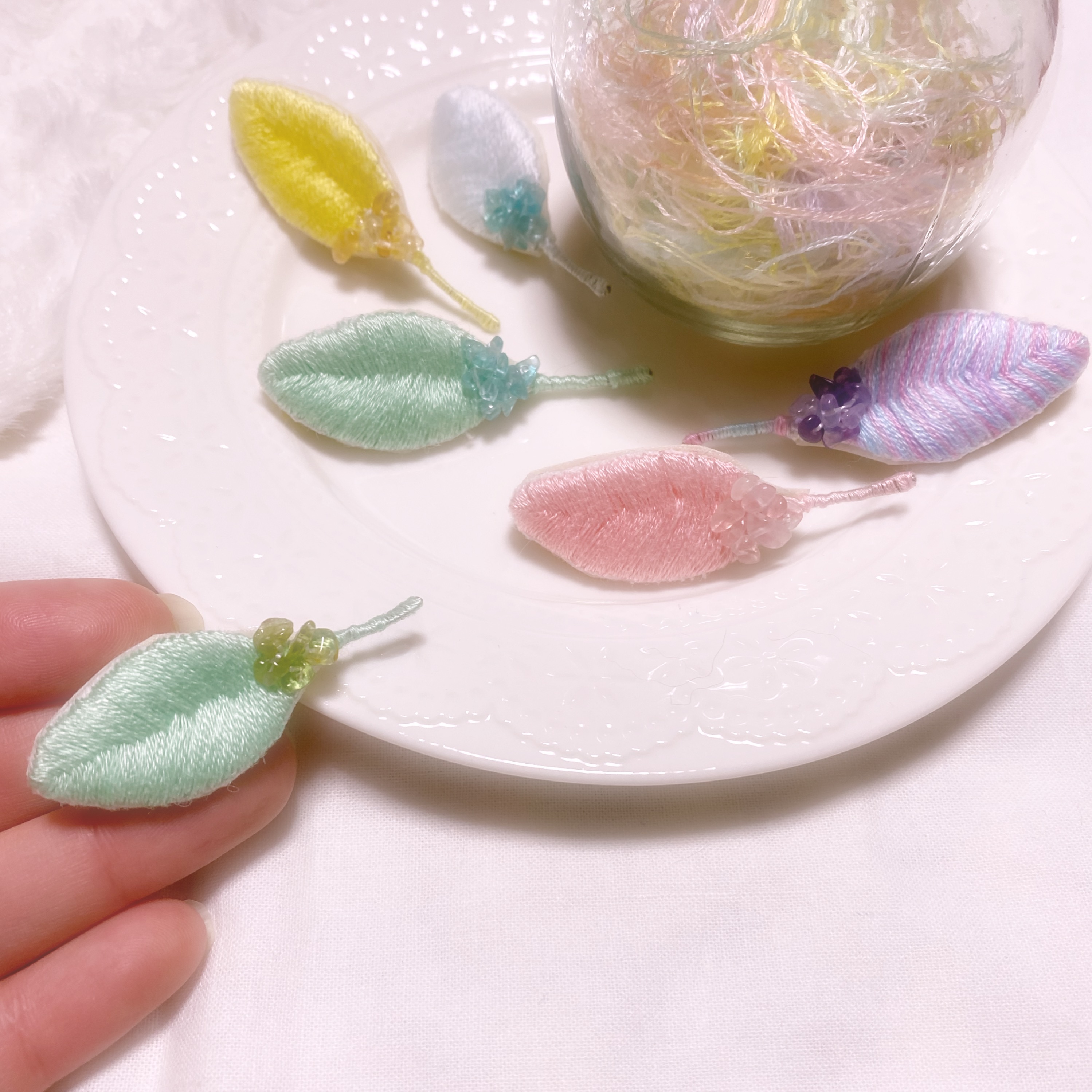 今回も、葉っぱの色味に合わせて天然石のさざれを縫付けました\( ¨̮ )/