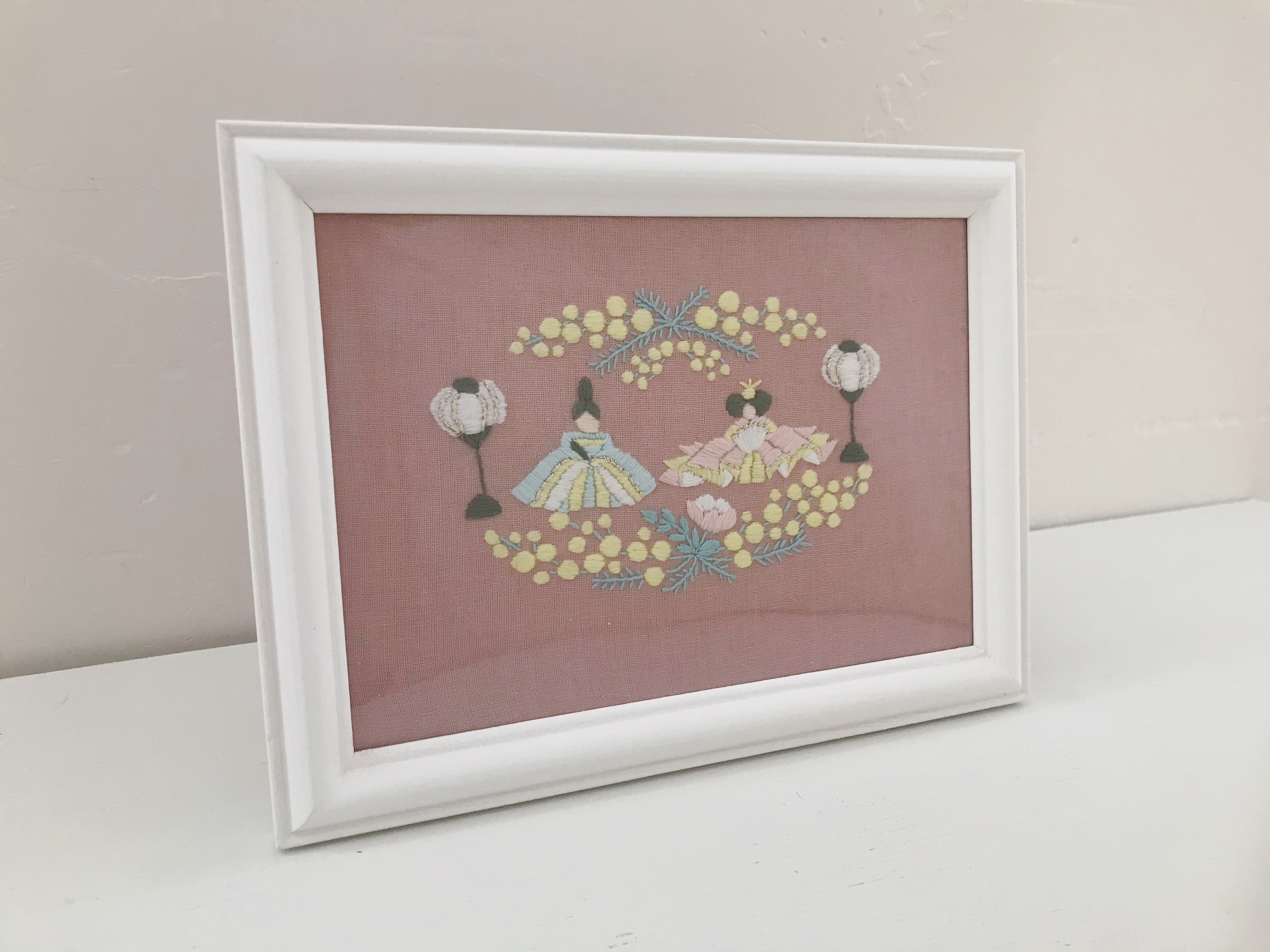 2人の娘の幸せを願いながら刺繍したので、飾る事ができるように小さな額に入れ仕立ててみました。