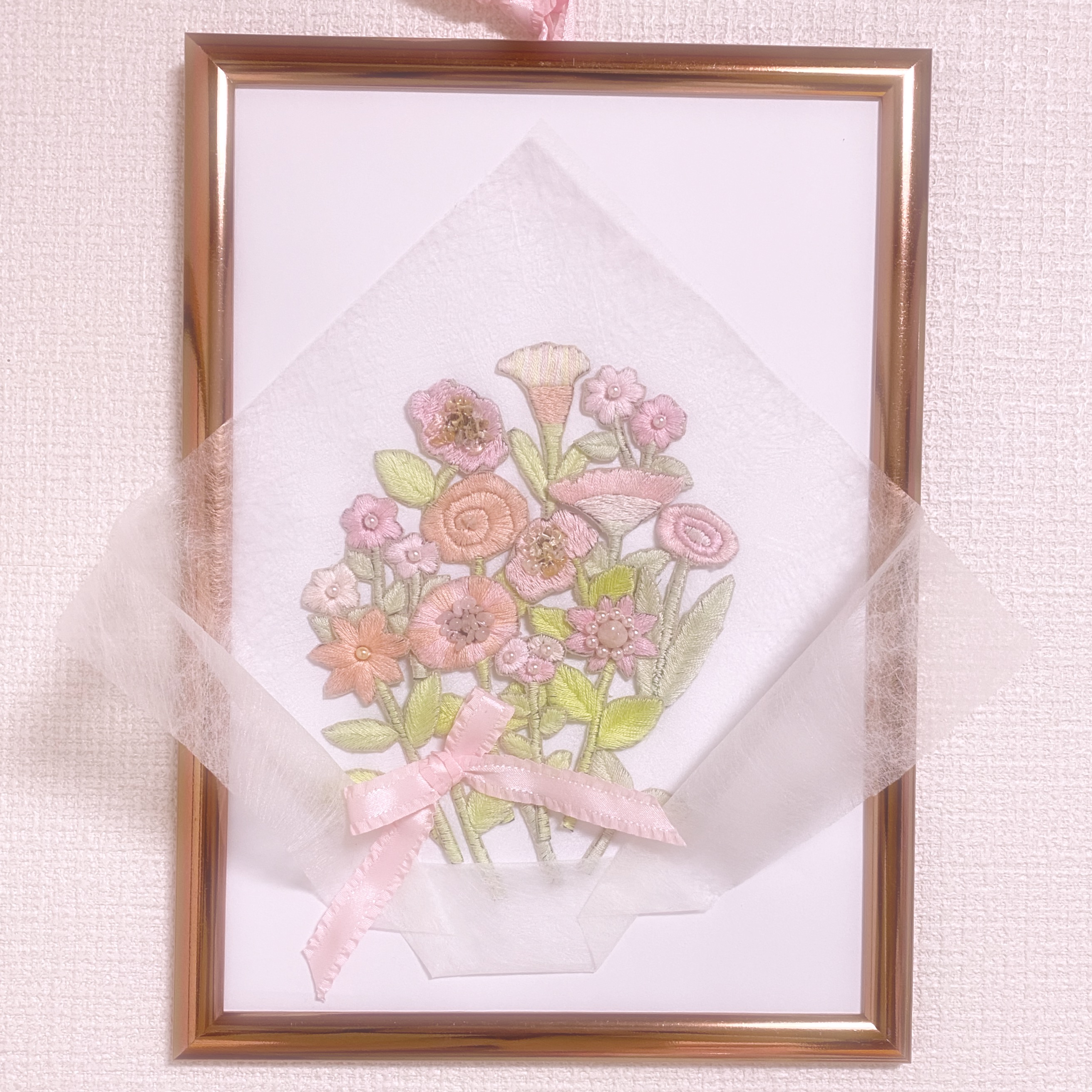花束に仕上げるために、同じような色味で縫ってみましたがいろんな色で縫うのも楽しいんだろうなあと思いました。今回はお花の縁の黒色をあえて残さずに縫いましたが、黒色を残して縫うのもまた雰囲気が変わって楽しいと思います。