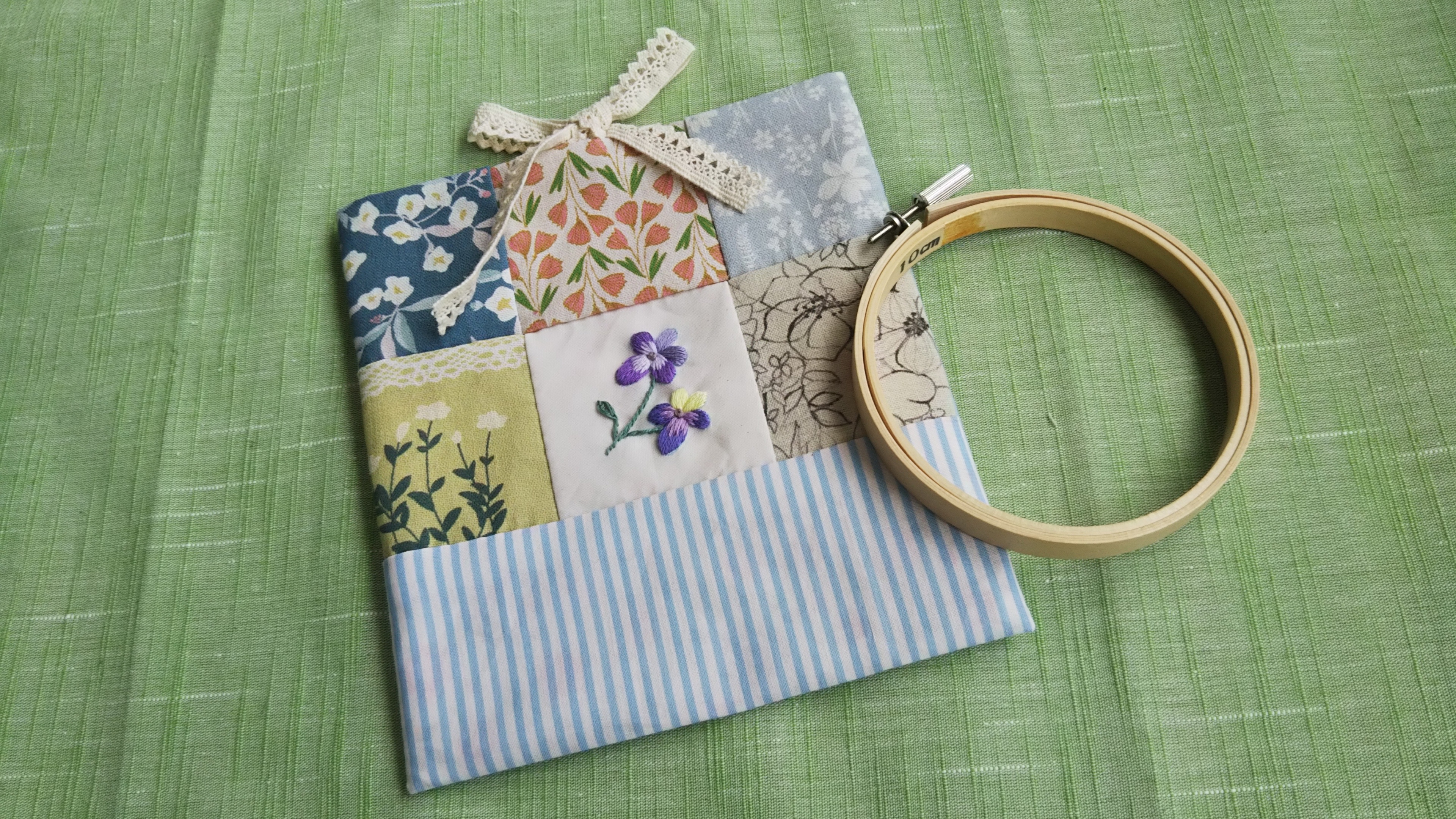 すてき!パッチワークのなかのビオラの刺しゅう、いい雰囲気ですね。刺しゅう枠のケースがあれば、刺しゅう枠がばらばらせずに居場所が決まりますね。私も作ってみたいです。