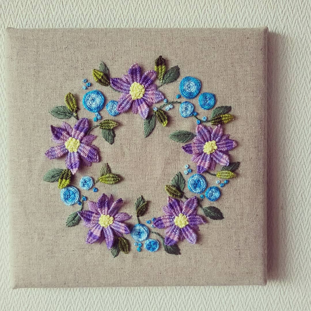Seasons5番刺しゅう糸のお花のリースが出来上がりました。それぞれが素敵なネーミング…花びらは「3月のすみれ」、ブルーの丸いお花は「8月の空」立体刺しゅうの葉は「5月の若葉」です。