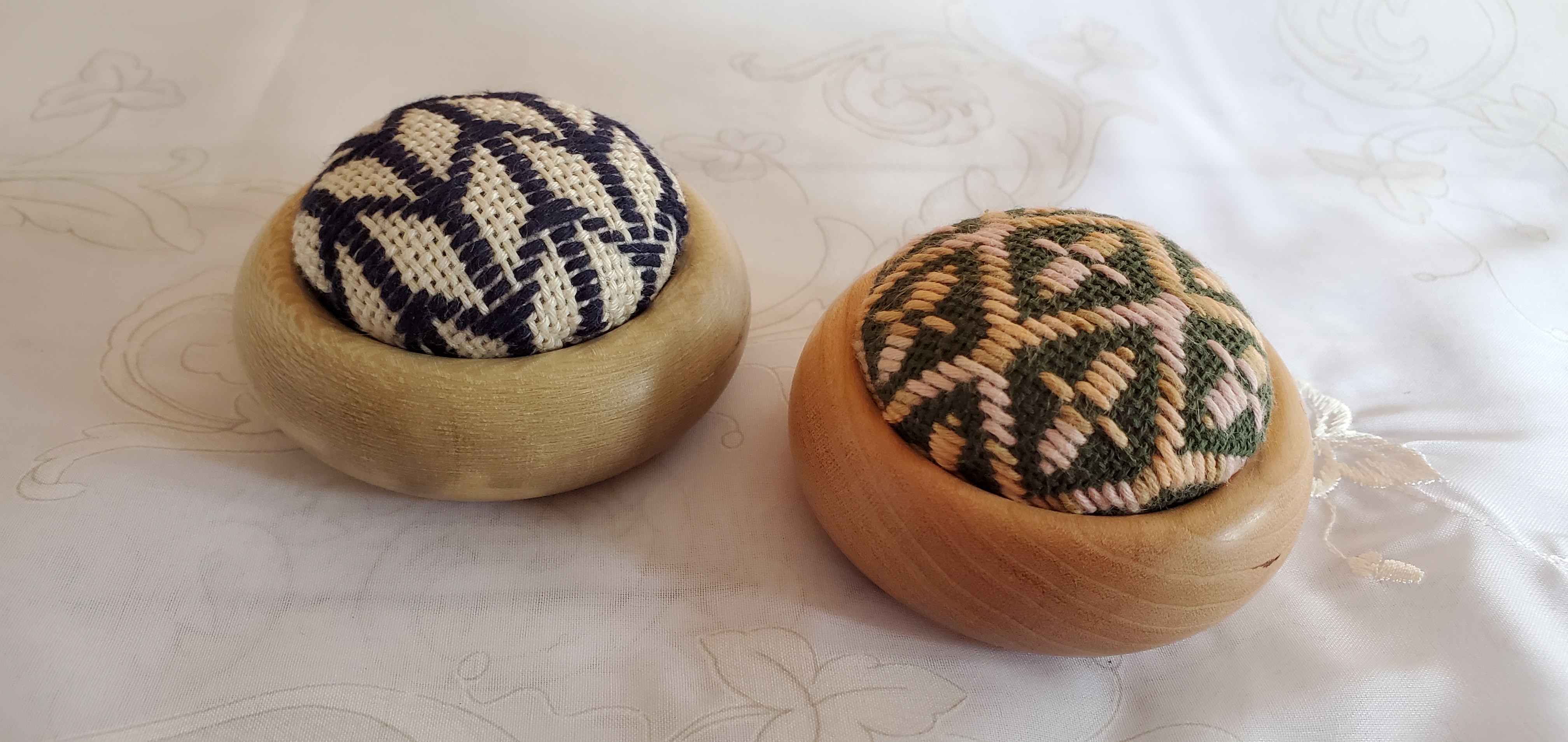 おうちで過ごす時間がたっぷりあったので、久しぶりにゆっくりこぎん刺しを楽しみ、素敵なウッドボウルに入れたピンクッションを作りました。