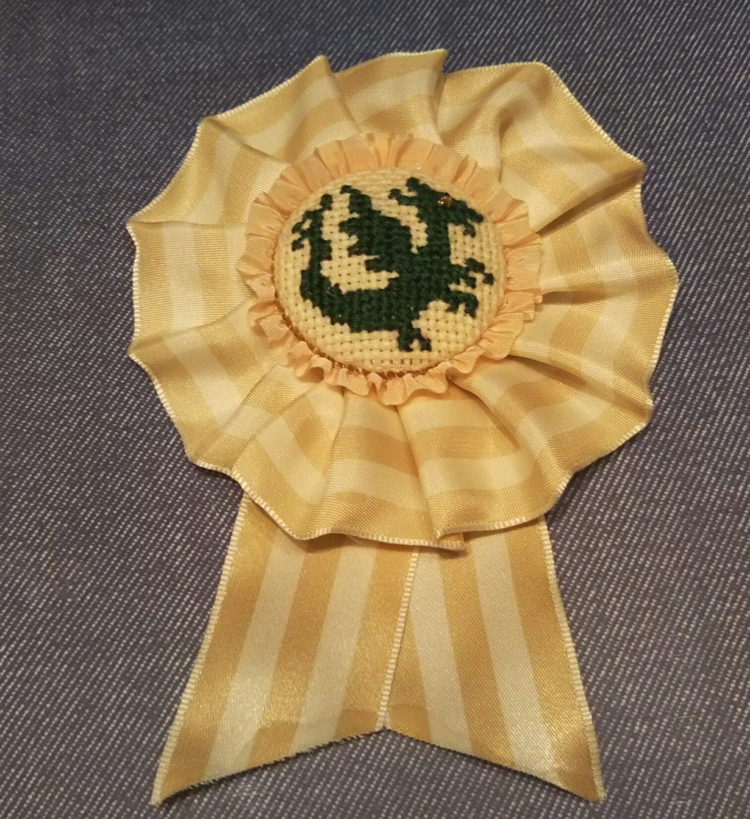 息子が地元のハロウィンフォトコンテストで頂いた賞が「ドラゴンもびっくりで賞」という賞でしたので、クロスステッチでドラゴンを刺繍したオリジナルロゼッタを作ってみました。(実質的には上から三番目の賞)改めておめでとうの気持ちを込めて♪ドラゴンの眼を「にしきいと」でキラキラさせてみました。