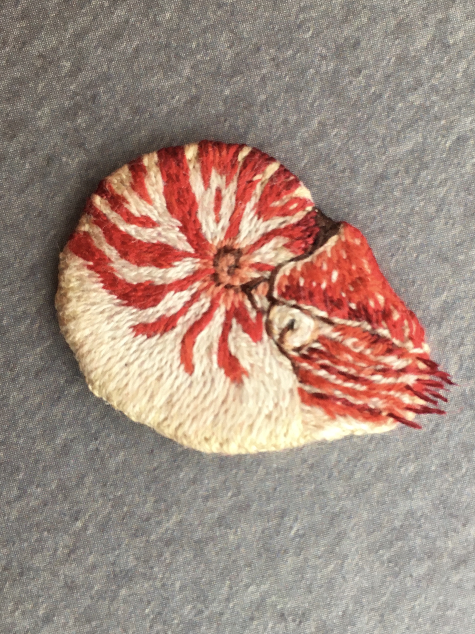 刺繍糸の色を微妙に変えて、立体的に仕上げました。500円玉くらいの大きさで、ブローチ にしました。