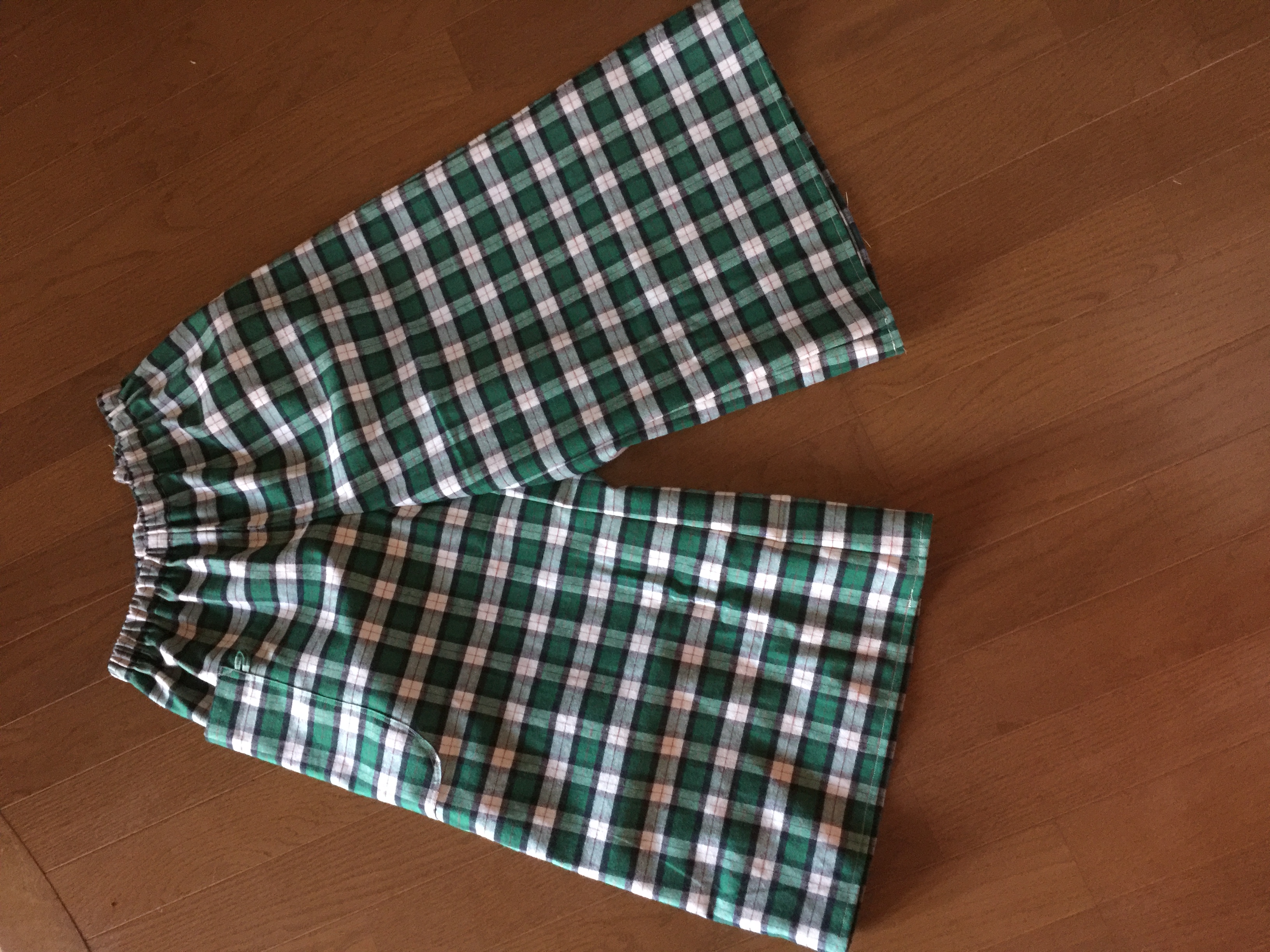 家族が忘年会と言うことで、午後から年末にお出かけの際のキュロットを作りました。パターンは同じで今回は一昨年の冬の残り生地ですが、緑のチェックにしました。今回はポケットを外付け、スマホが入る用に大きくして見ました。