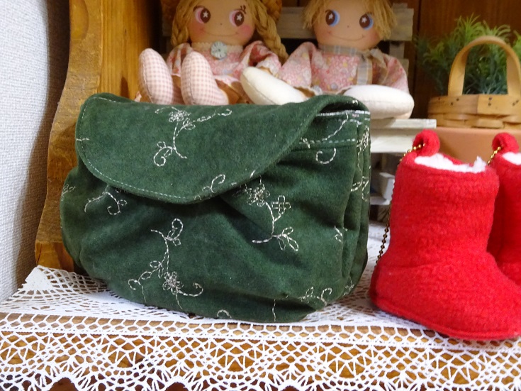 素材はベルベット風の手触りの化繊だと思います。上品な素材感と刺繍でお気に入りの生地でしたがもったいなくてなかなかハサミをいれられず!クリスマス前に思い切ってクリスマスプレゼント用に作りました。