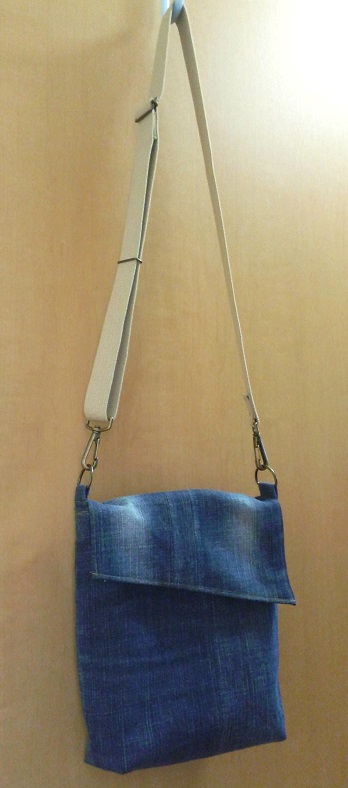 履かなくなったジーンズがもったいなかったので、パパでも使える斜め掛けバッグにしました。足の部分を使ったので、ちょうど中央辺りで布を繋いでいます。