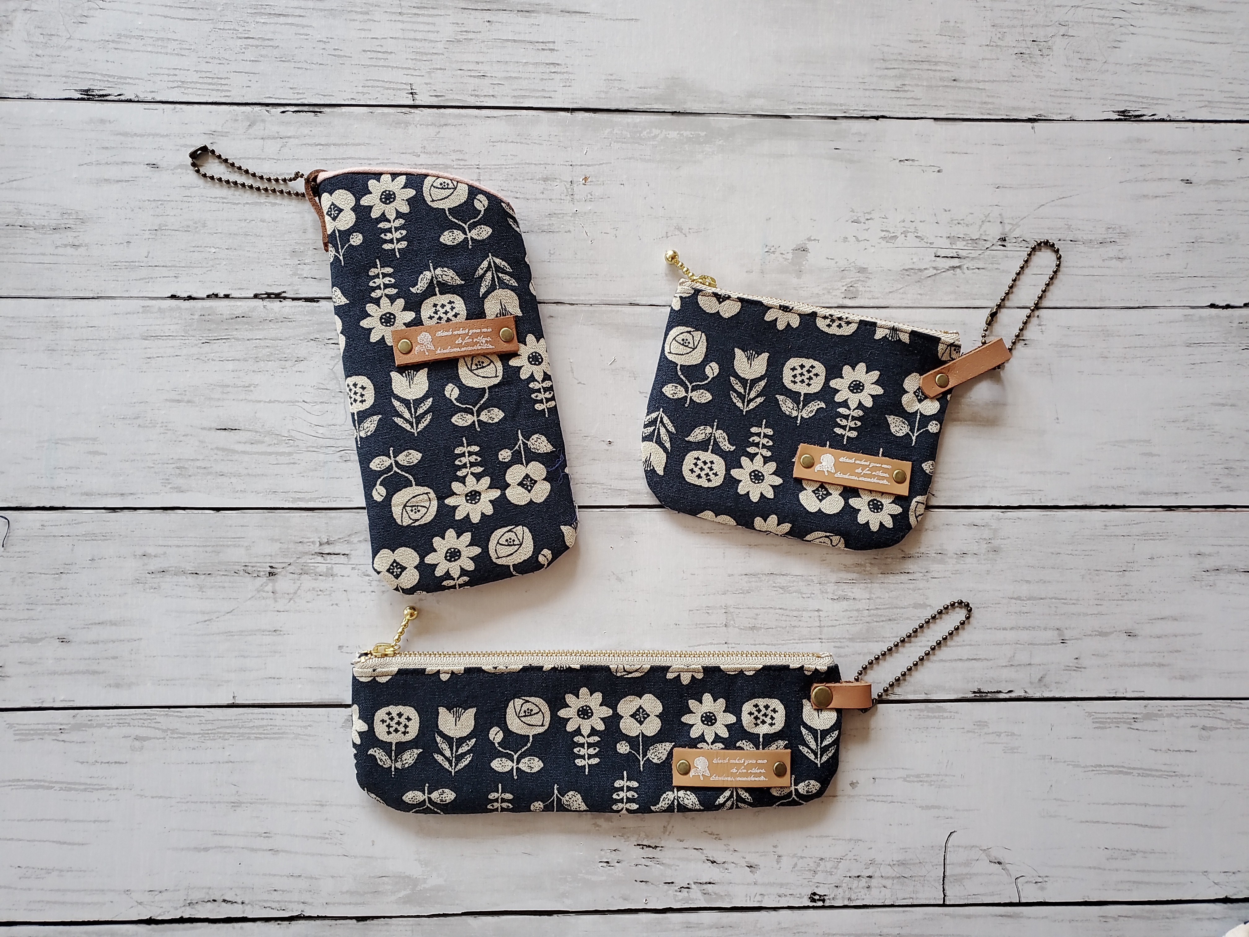メガネケース、ミニポーチ、スリムペンケースの三点セット。