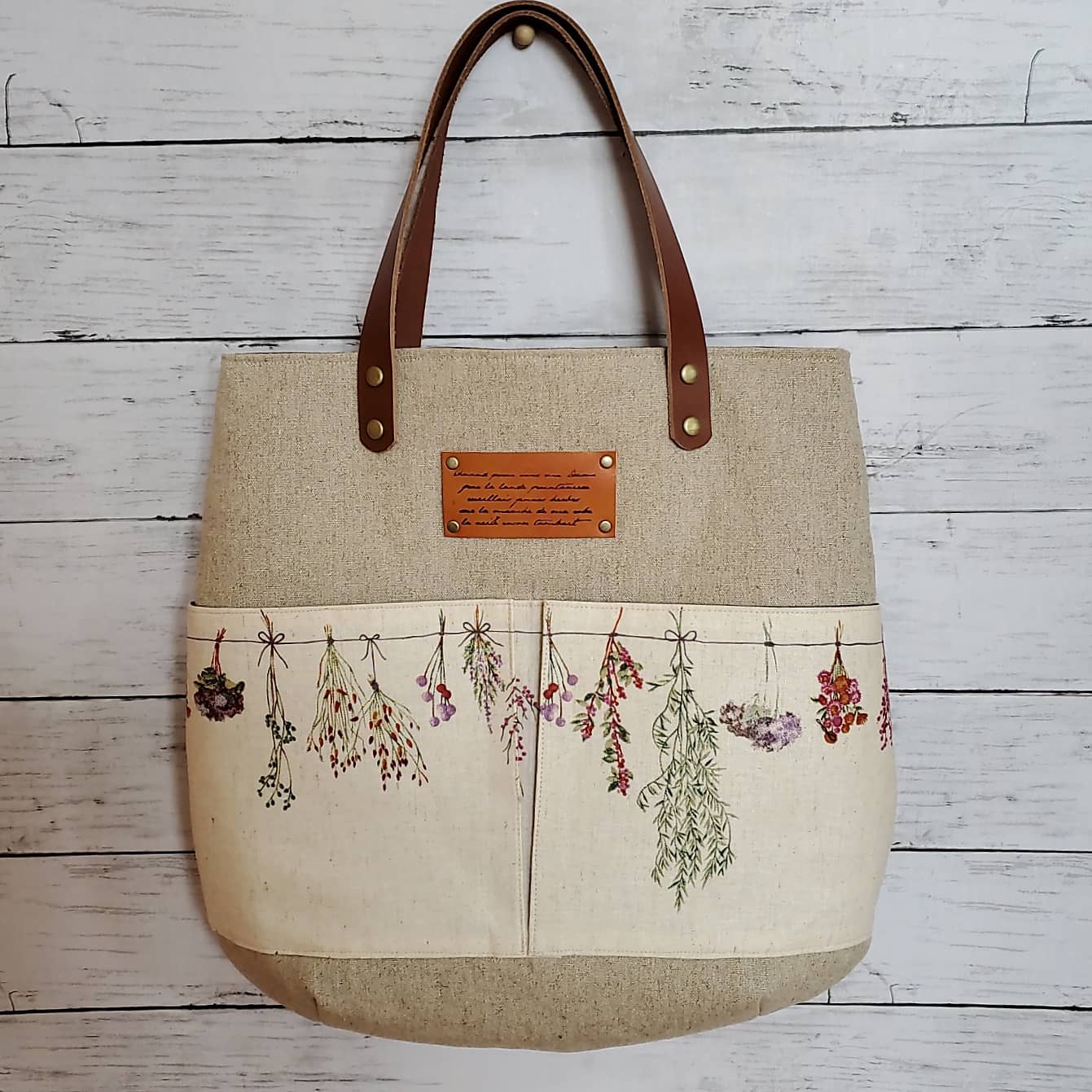 ハーフリネンにスワッグ柄のポケットを付けたバッグ。裏にもポケット、中にもポケットを。