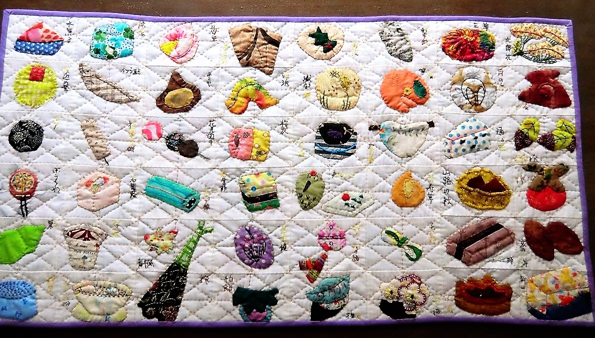 いろいろな端切れと、刺繍糸と、キルティングの道具があれば、作れますね。今は「お菓子で作る面白いお顔」その次は「ハロウイン」に挑戦する予定です。テーマを決めると、作りやすいです~