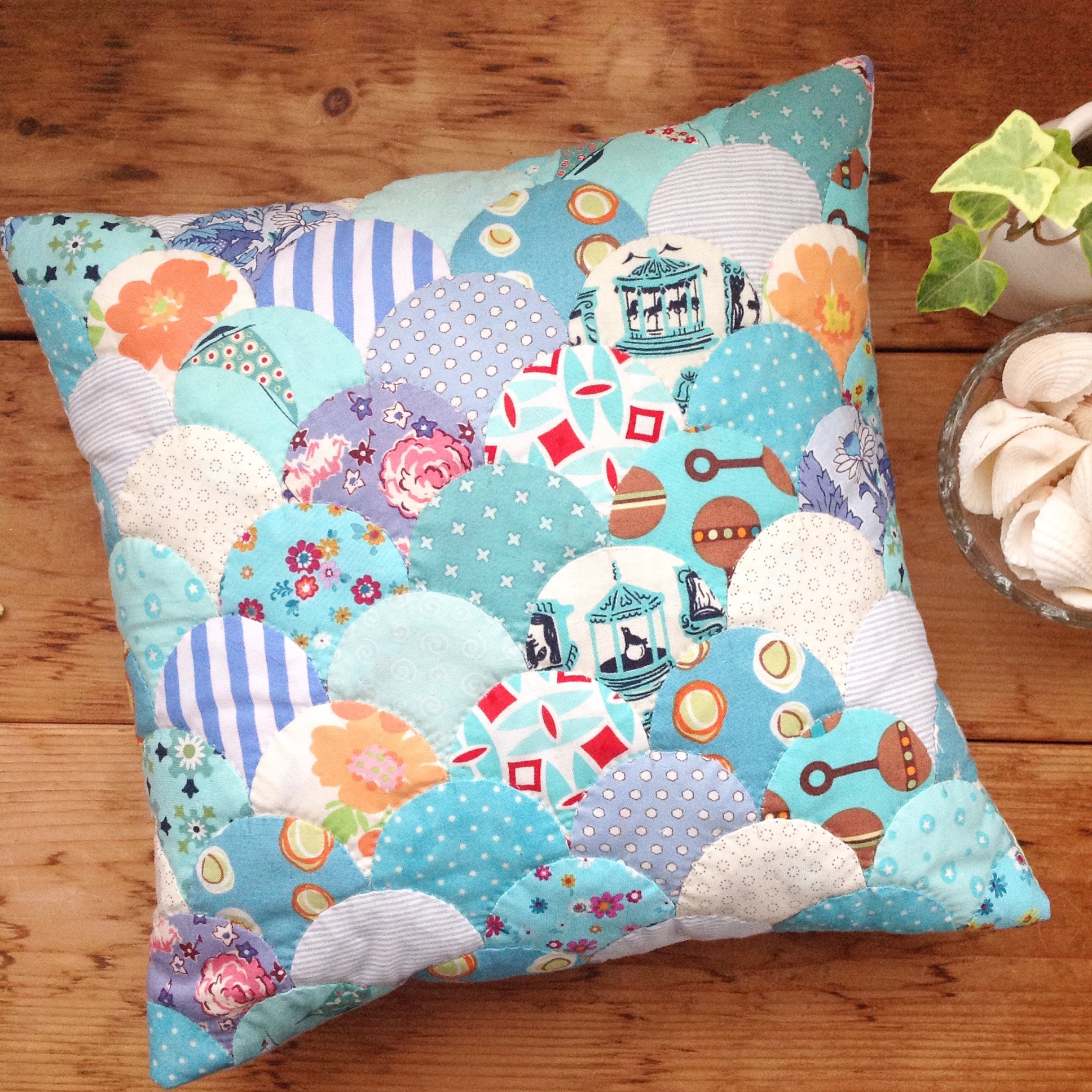 クラムシェルのパターンでクッションを作りました。イメージは海辺の近くに住んでいるのでブルーのハギレを使いました。