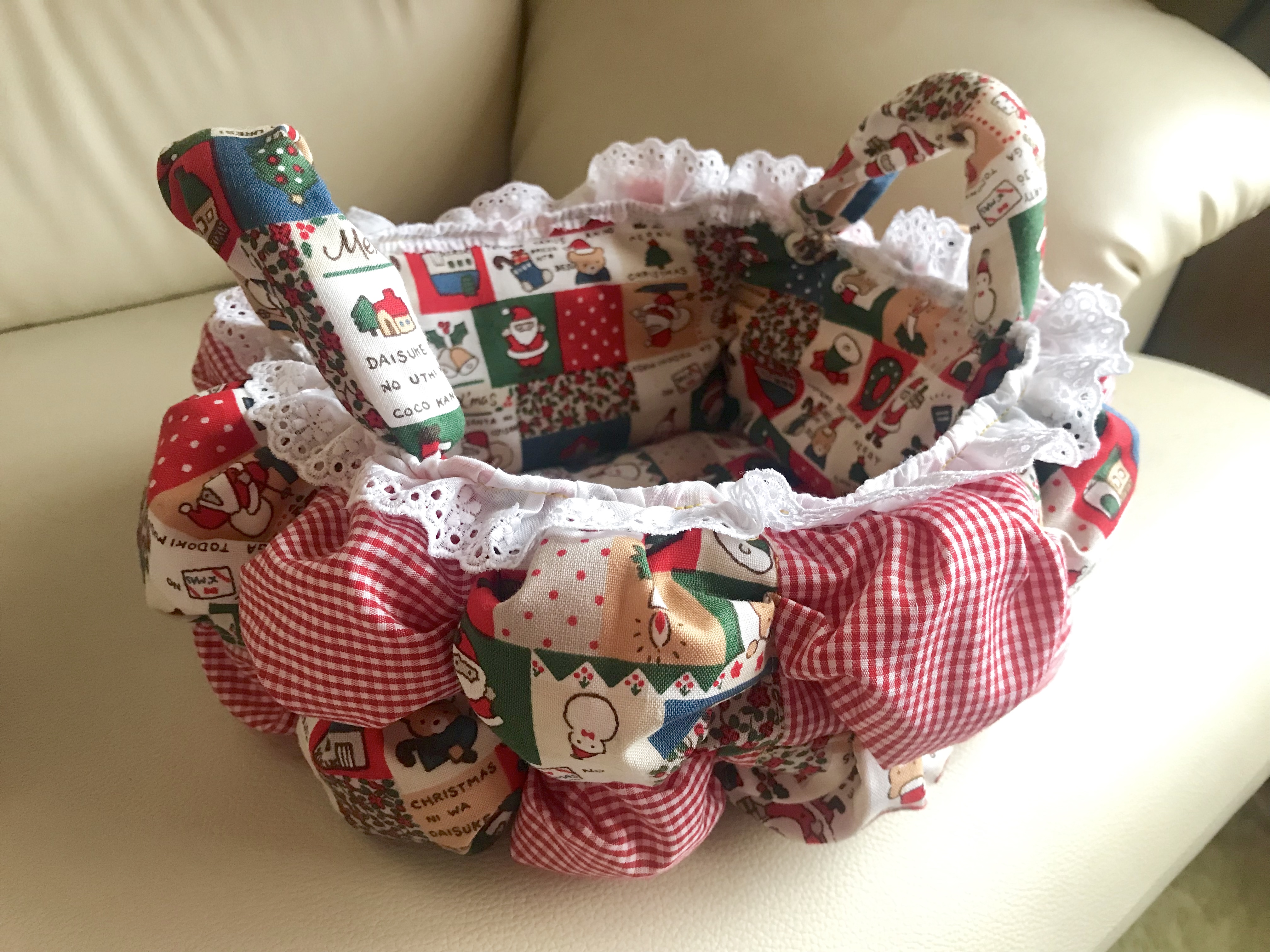 クリスマス柄の布を使って、ふわふわバスケットを作りました♪