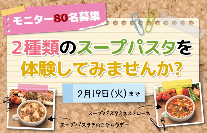 モニターに当選した方には、「デリシャスKitchen スープパスタ きのこチャウダー」「デリシャスKitchen スープパスタ ミネストローネ」各1個をお届けします。