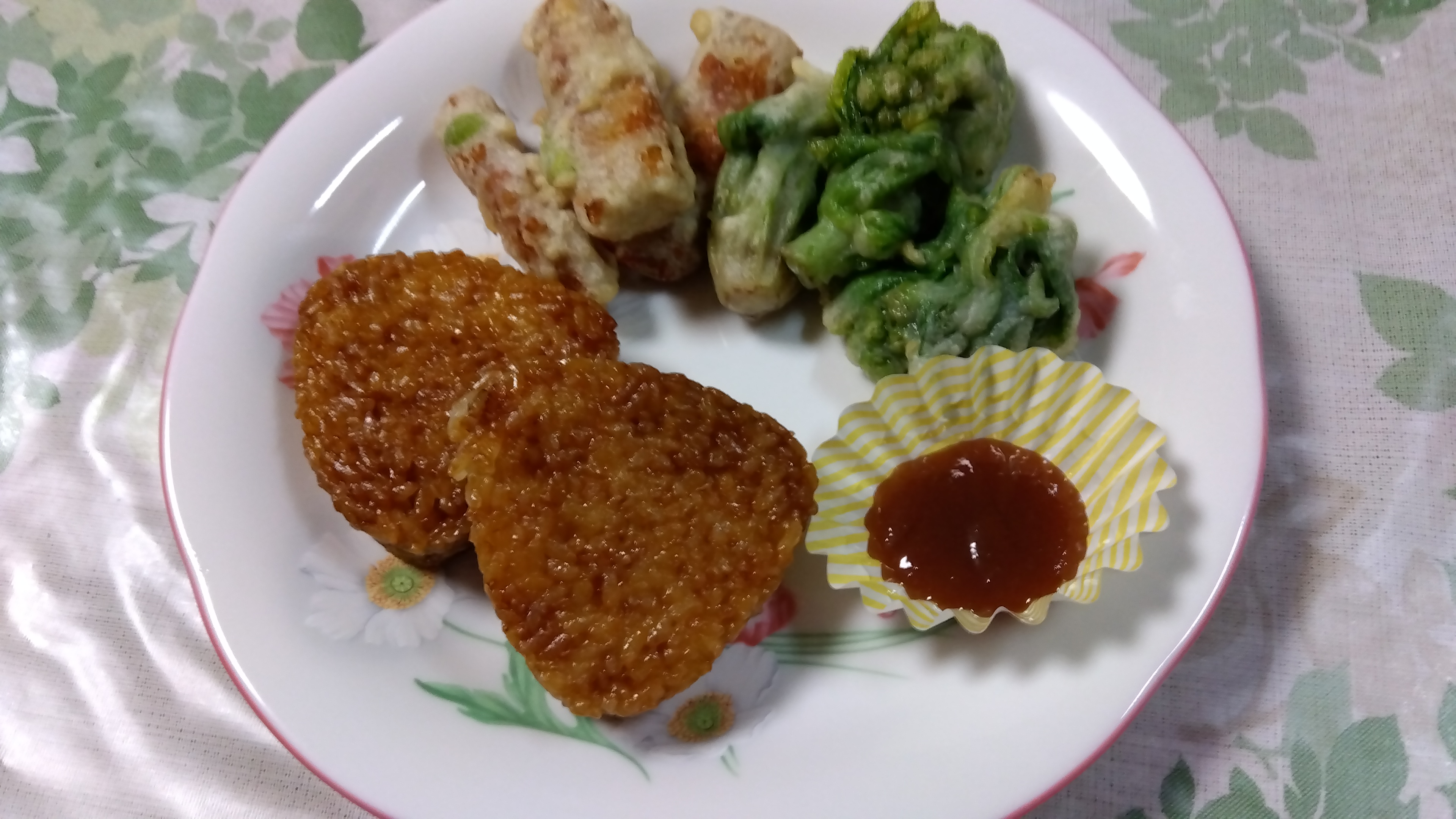大きな焼きおにぎりとふきのとうの天ぷらです(*^^*)