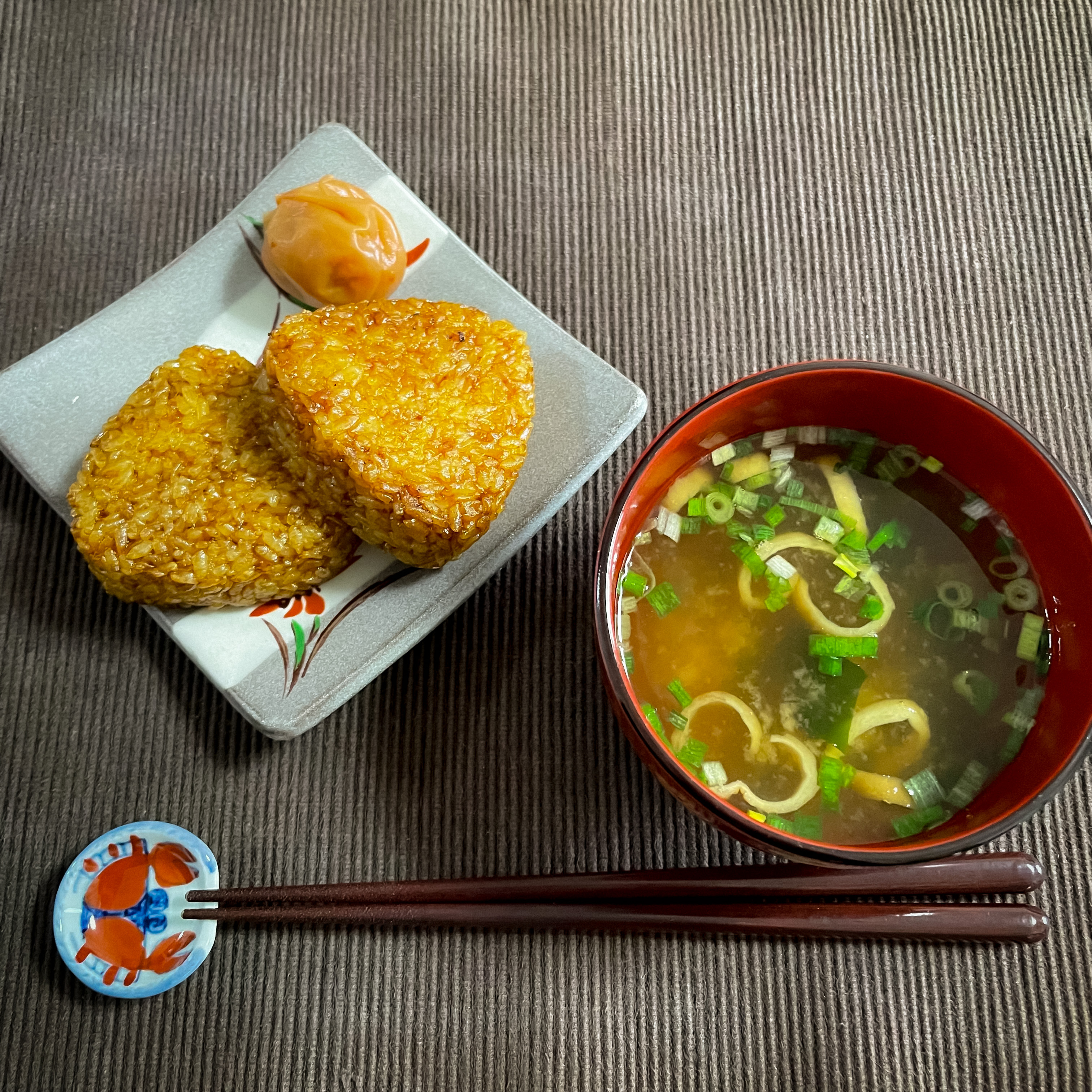 焼きおにぎりの香ばしい香りとお味噌汁食欲をそそりますね。